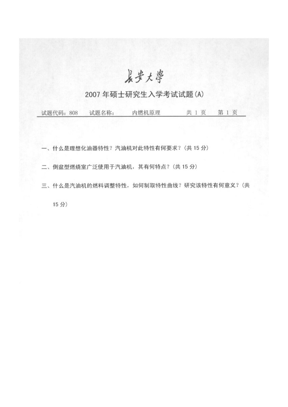 长安大学807内燃机原理2007年真题