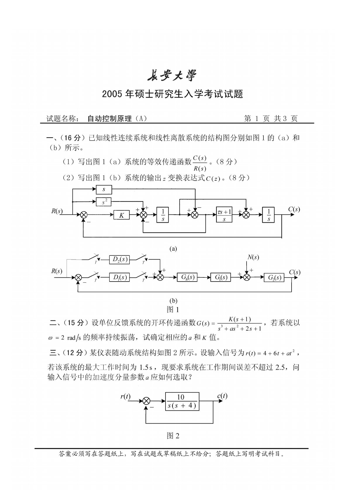 长安大学812自动控制理论2005年真题