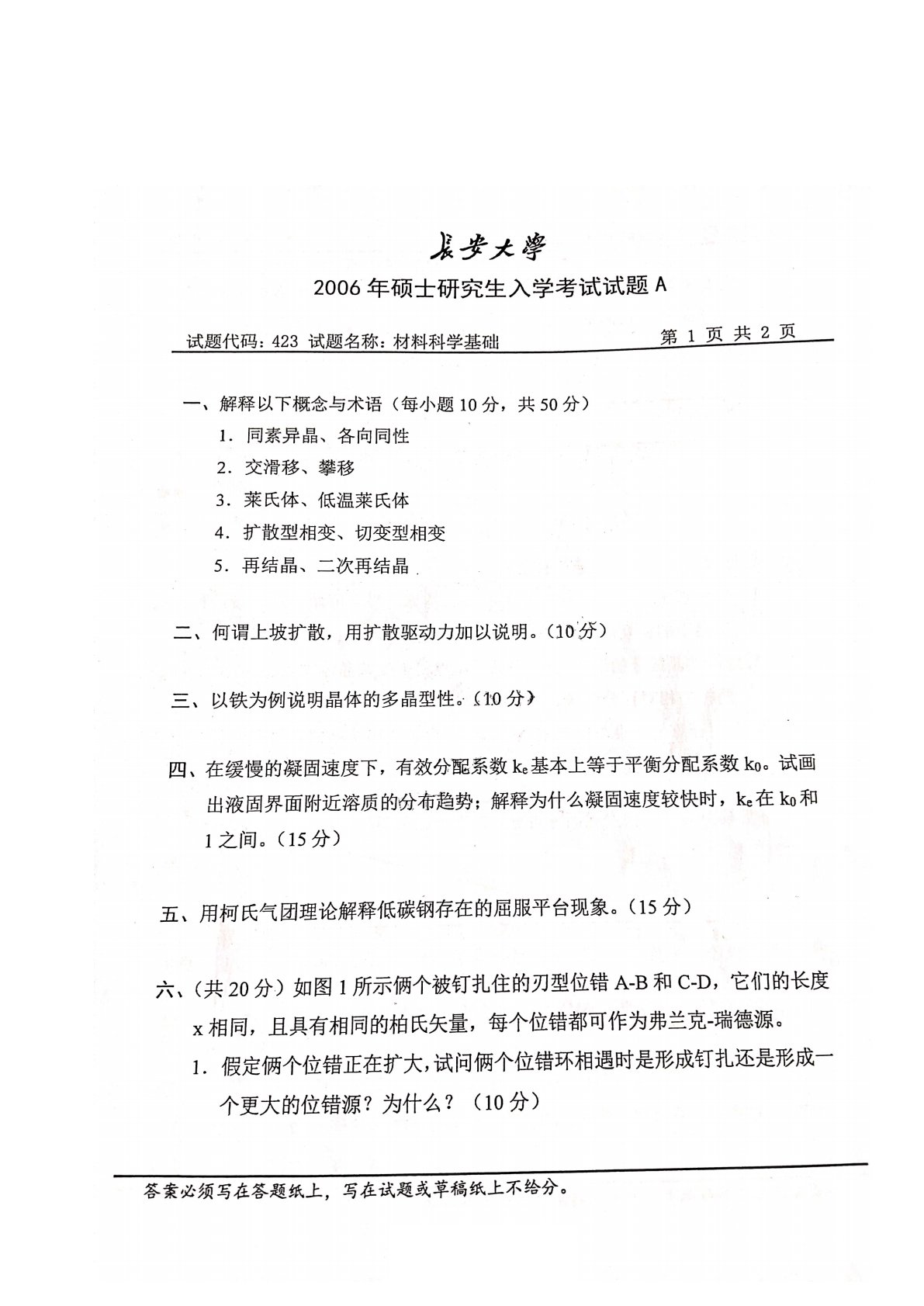 长安大学838材料科学基础2006年真题