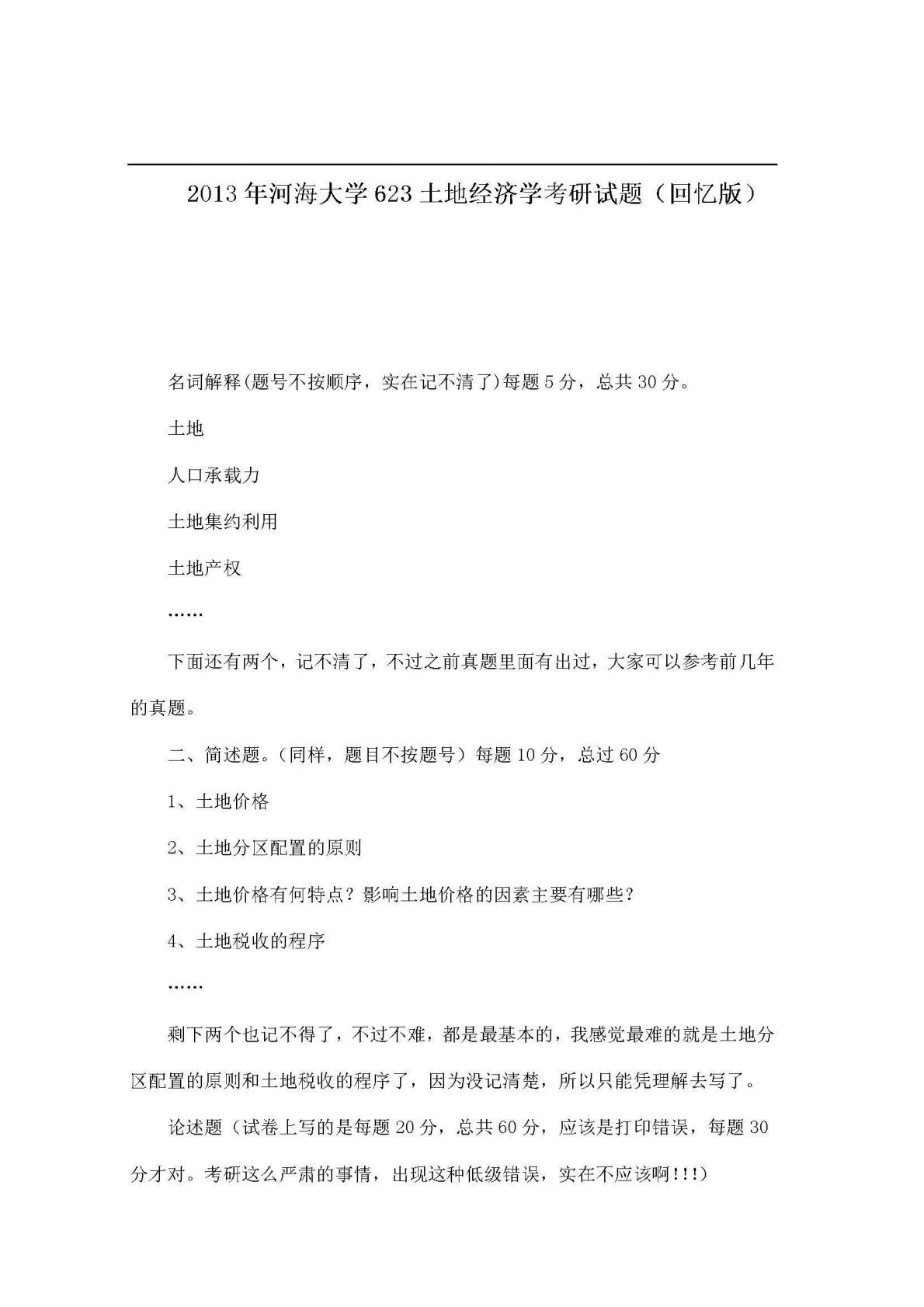 河海大学623土地经济学2013年真题回忆版