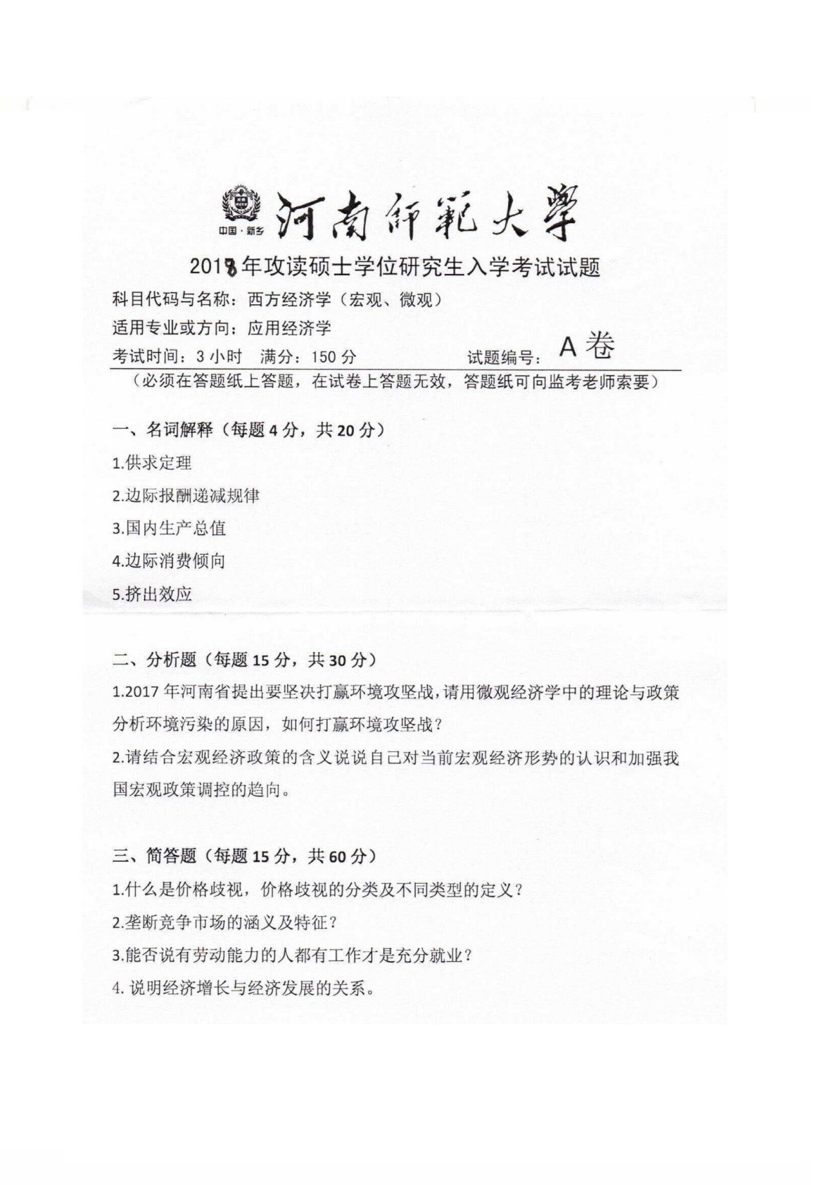 河南师范大学876西方经济学(宏观、微观)2018年真题