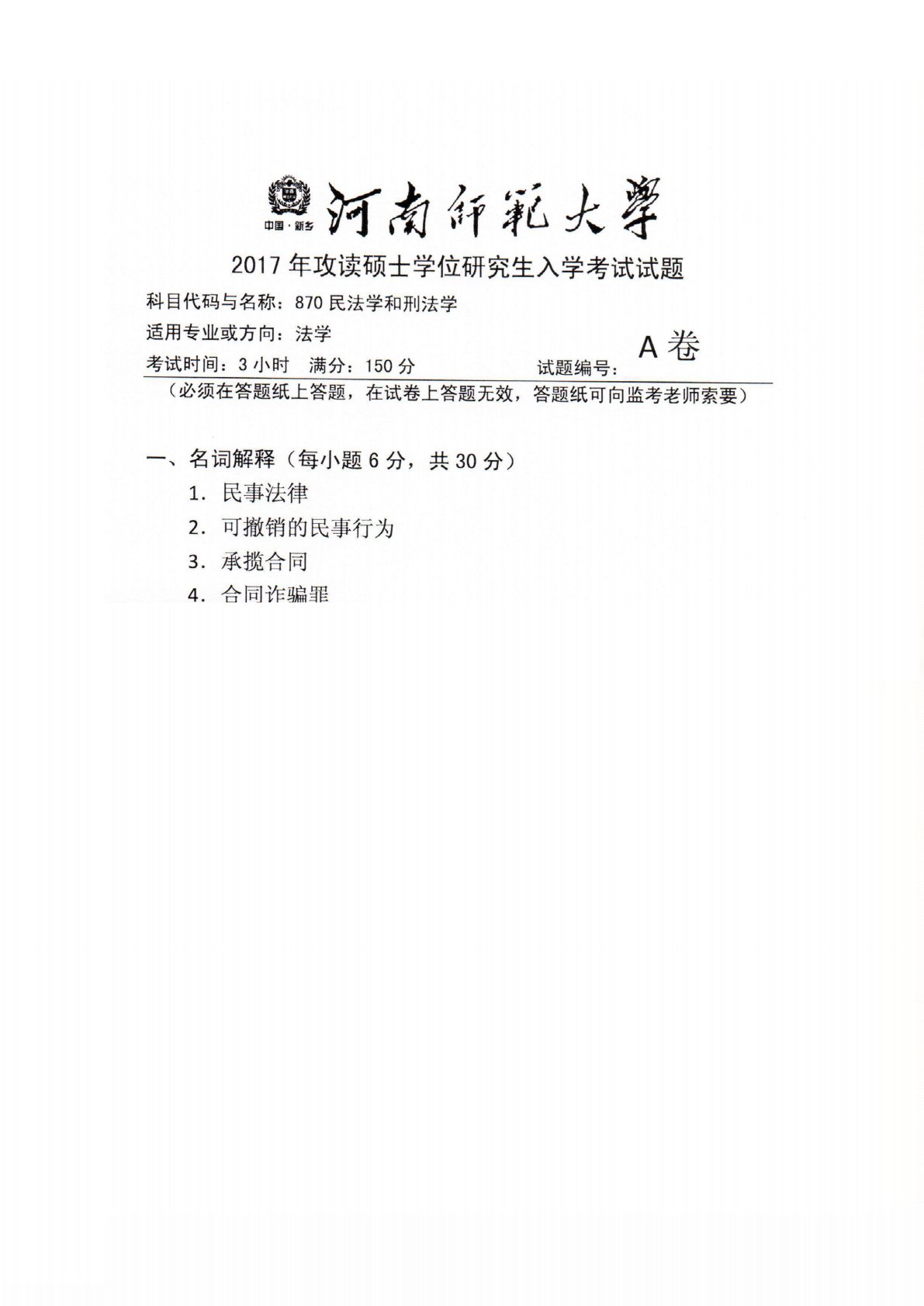 河南师范大学870民法学和刑法学2017年真题