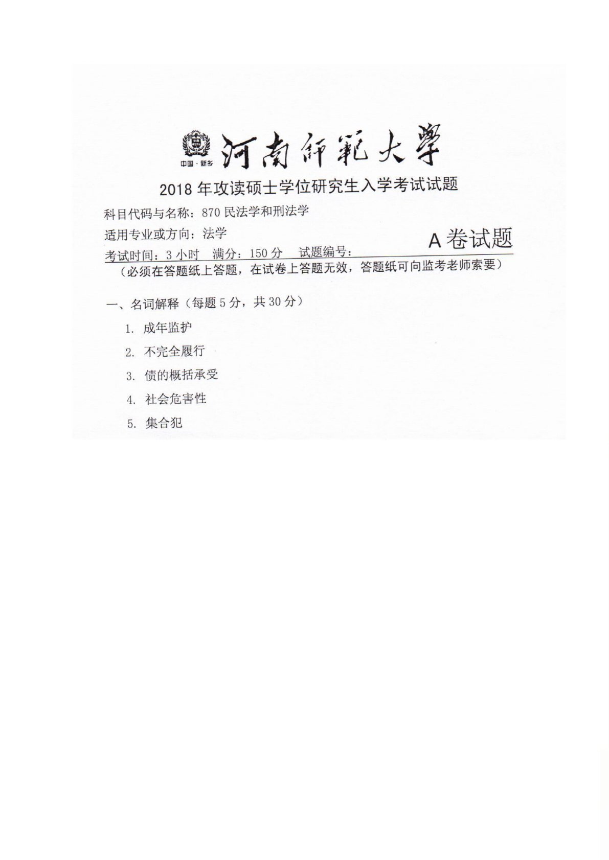 河南师范大学870民法学和刑法学2018年真题