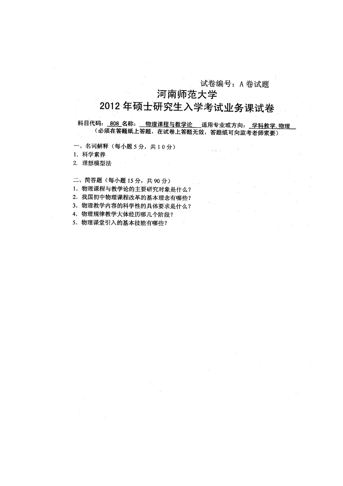 河南师范大学810物理课程与教学论2012年真题