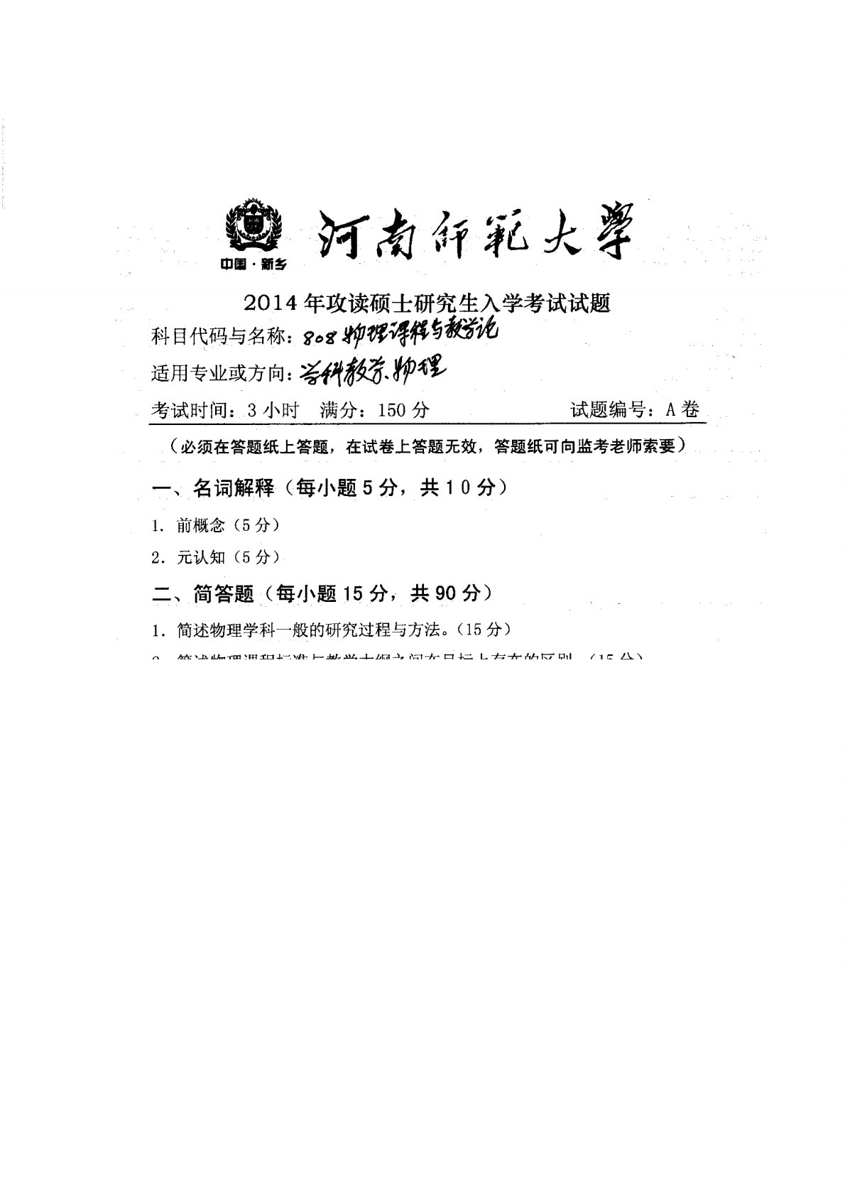 河南师范大学810物理课程与教学论2014年真题