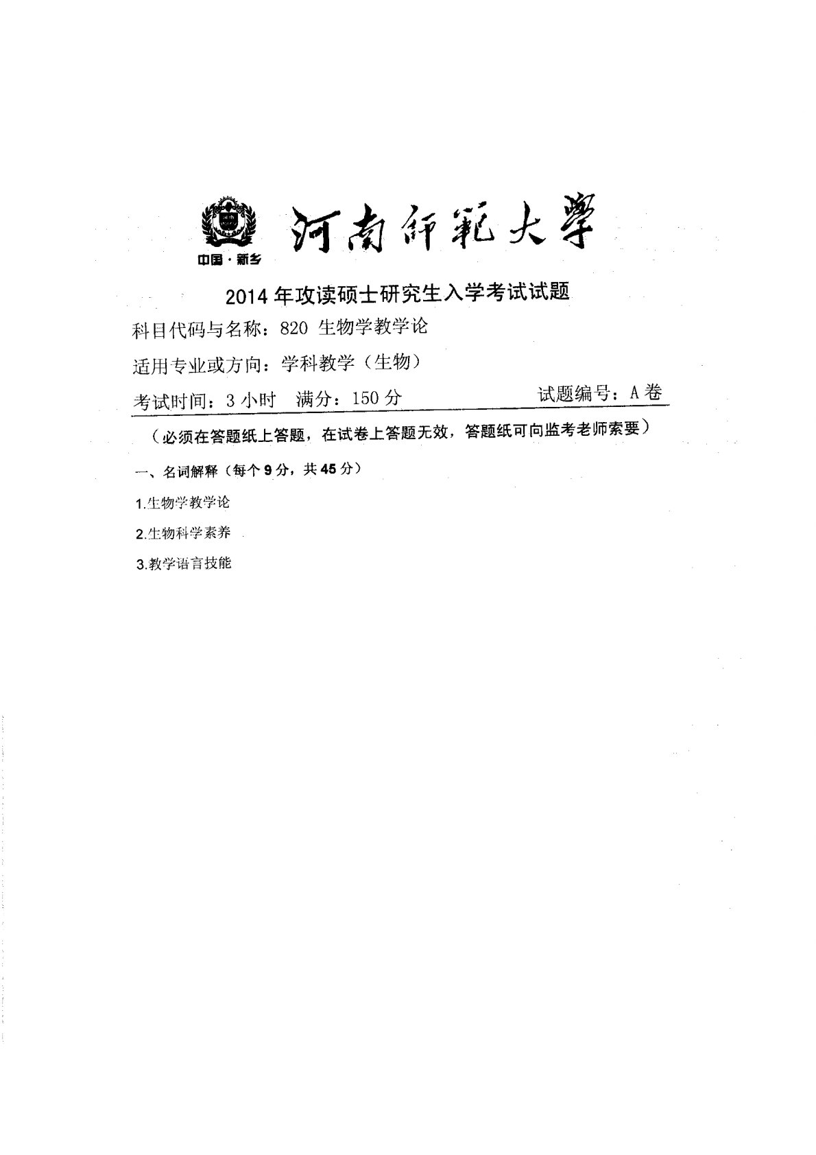 河南师范大学819生物教学论2014年真题