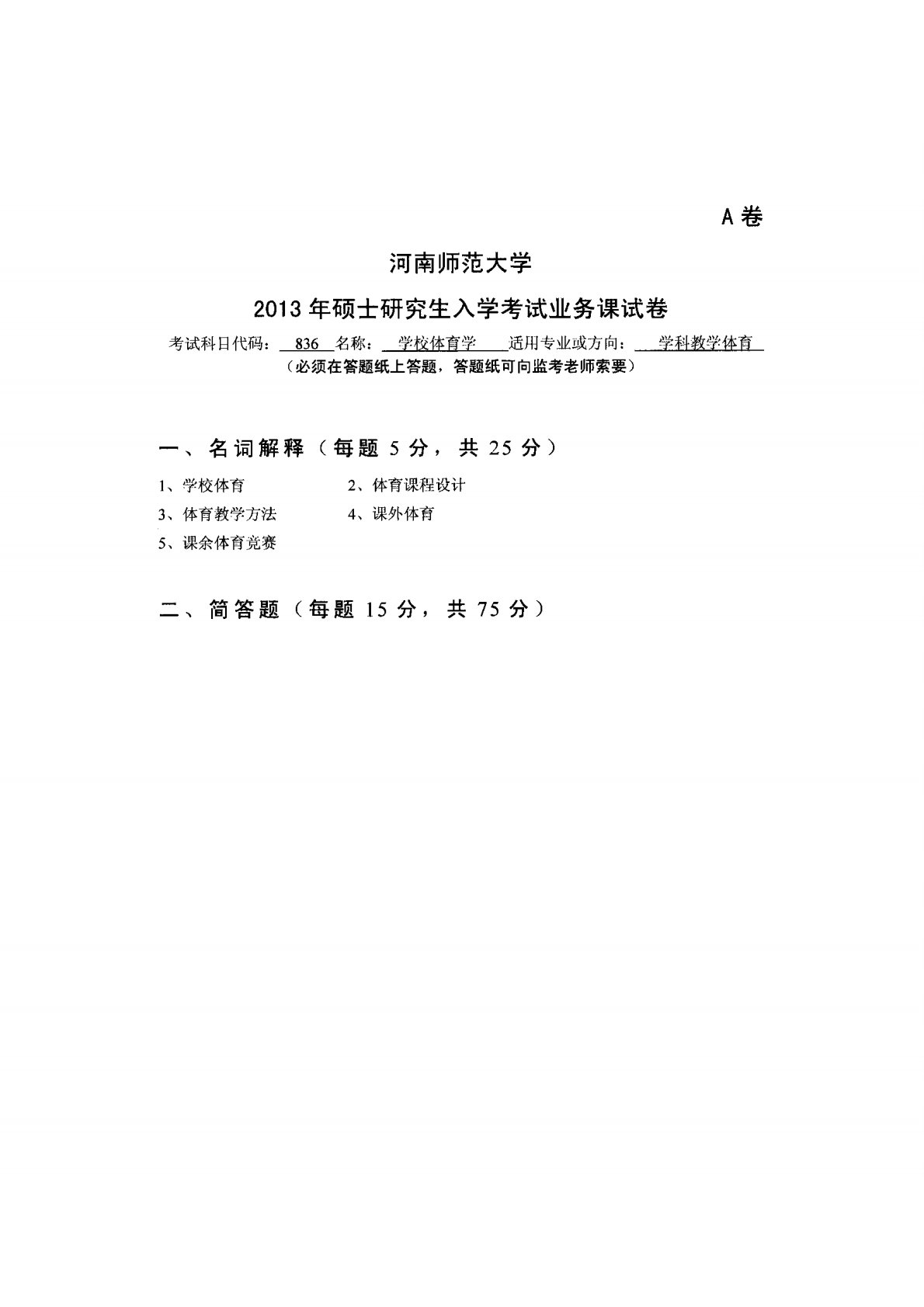 河南师范大学836学校体育学2013年真题
