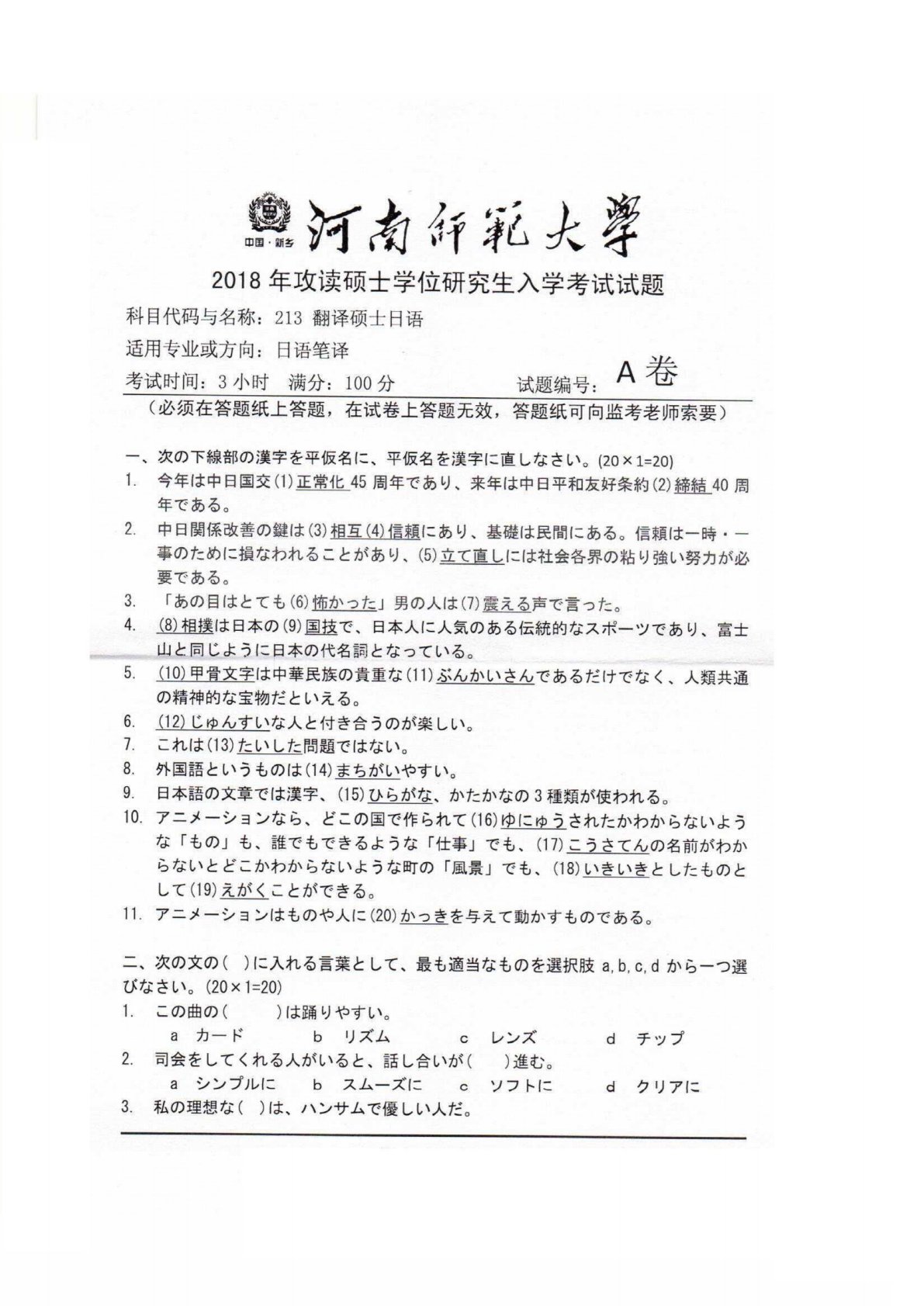 河南师范大学213翻译硕士日语2018年真题