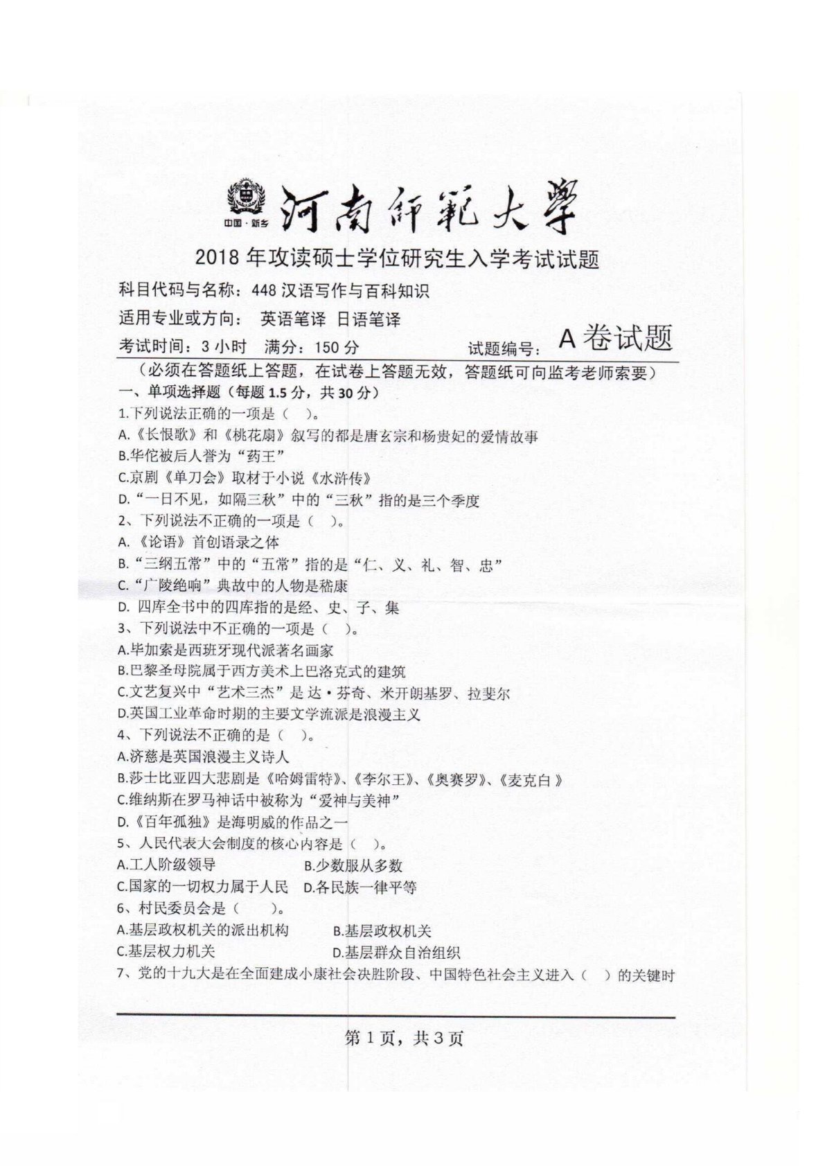 河南师范大学448汉语写作与百科知识2018年真题