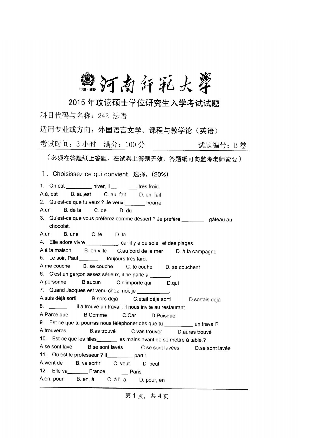 河南师范大学242法语2015年真题