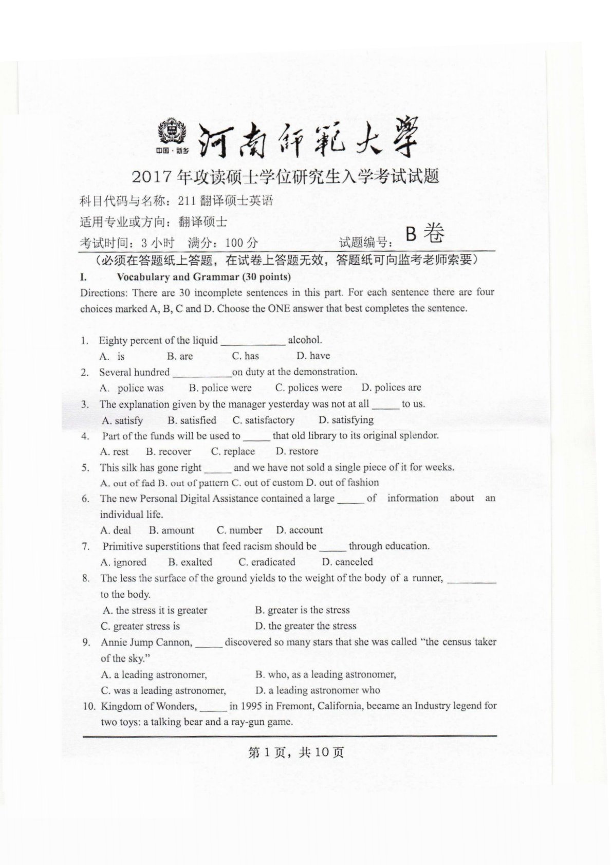 河南师范大学211翻译硕士英语2017年真题