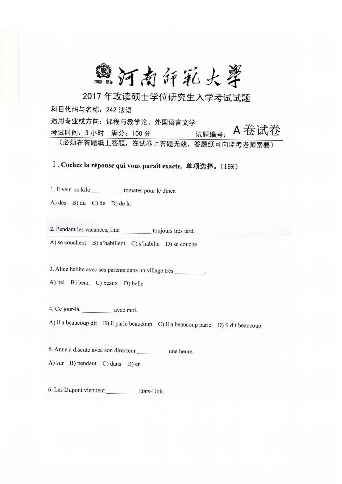 河南师范大学242法语2017年真题