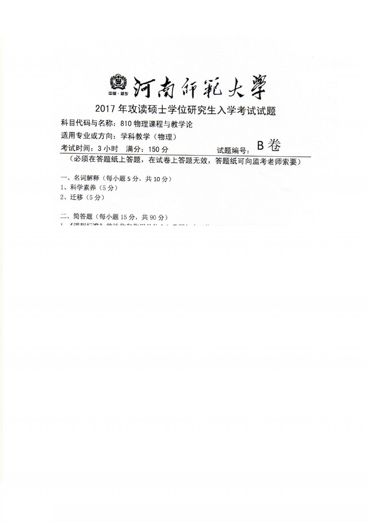 河南师范大学810物理课程与教学论2017年真题