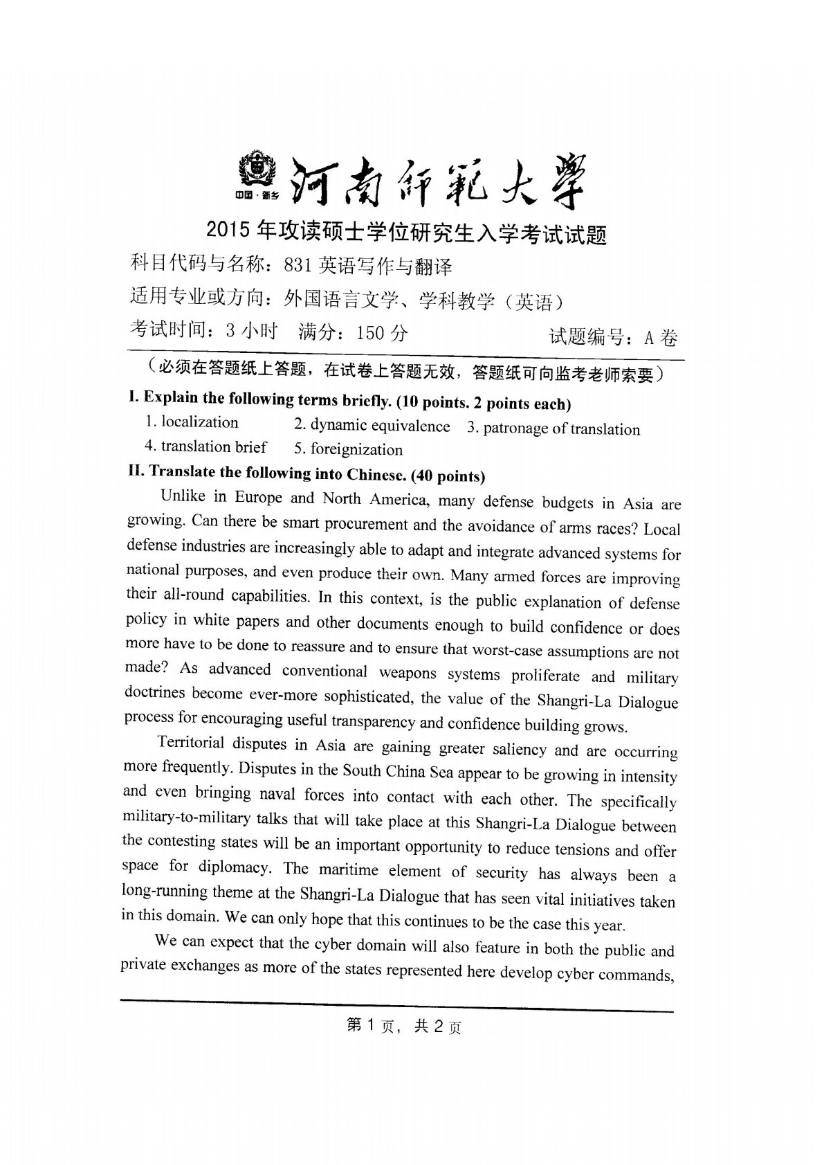 河南师范大学831外语写作与翻译2015年真题