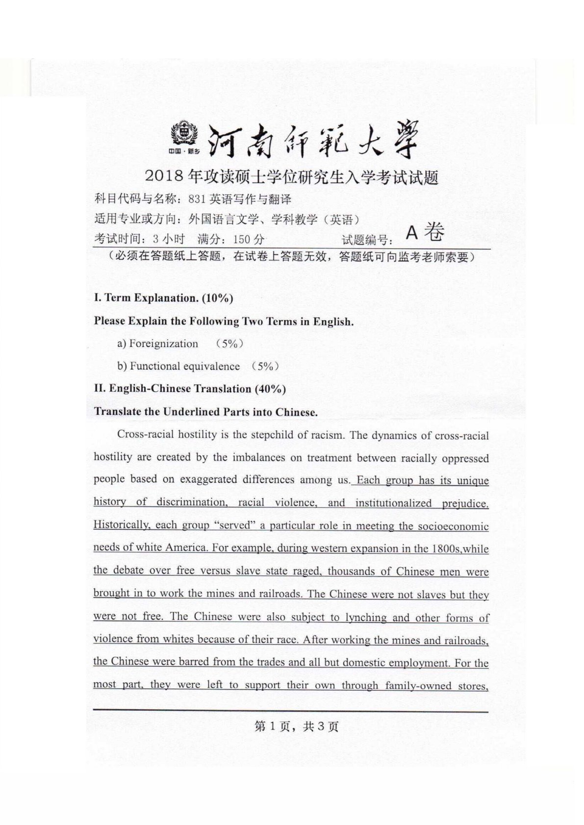 河南师范大学831外语写作与翻译2018年真题
