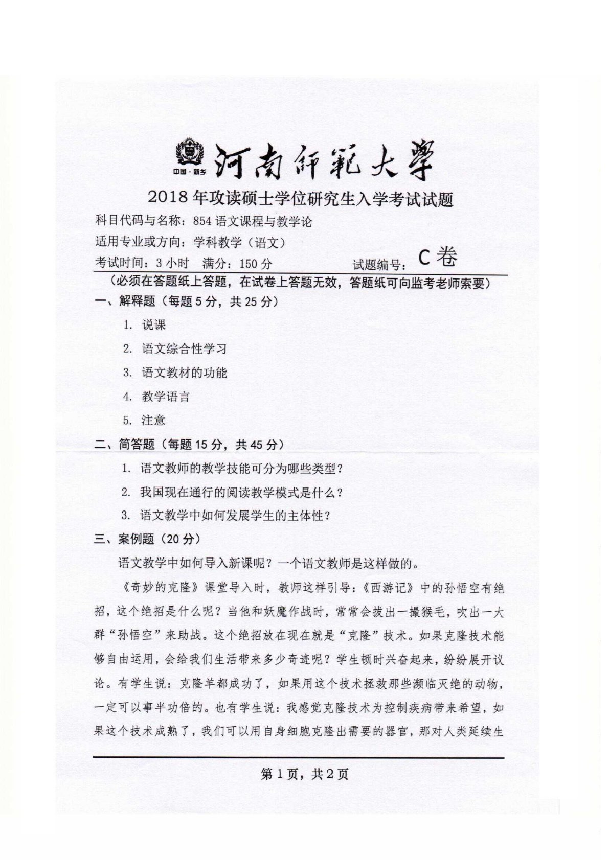 河南师范大学854语文课程与教学论2018年真题