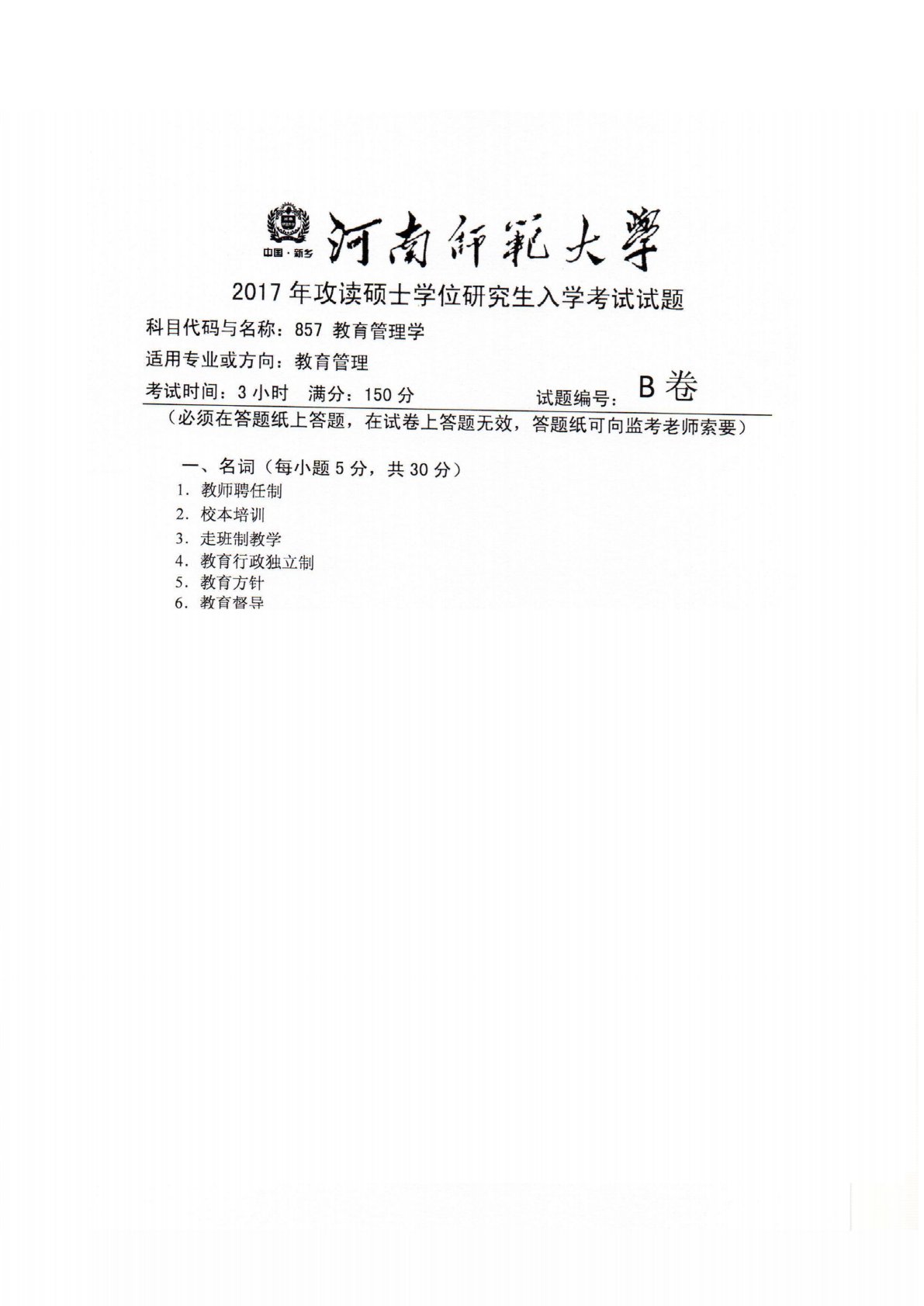 河南师范大学857教育管理学2017年真题