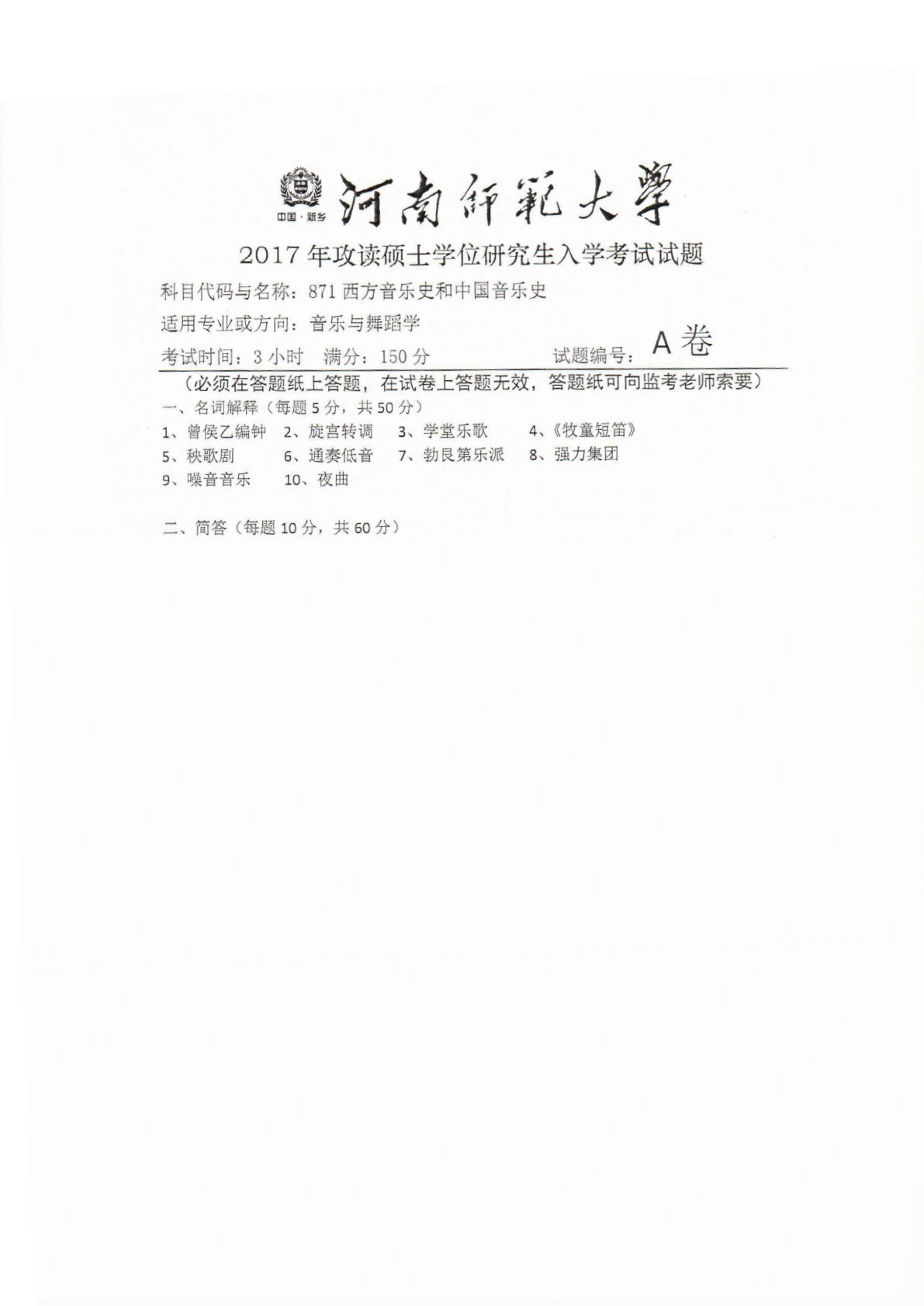 河南师范大学871西方音乐史和中国音乐史2017年真题