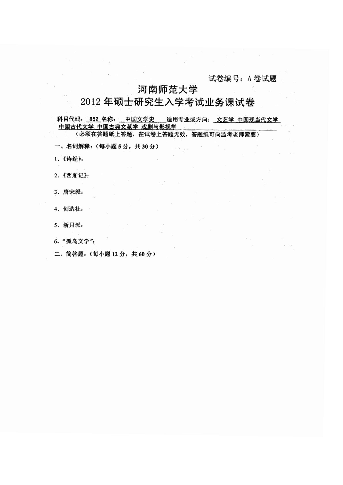 河南师范大学852中国文学史2012年真题