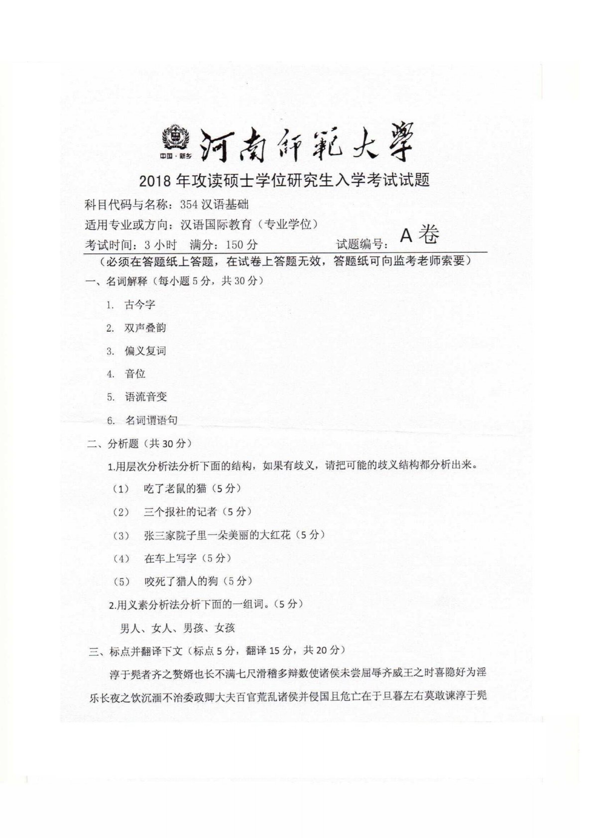 河南师范大学354汉语基础2018年真题