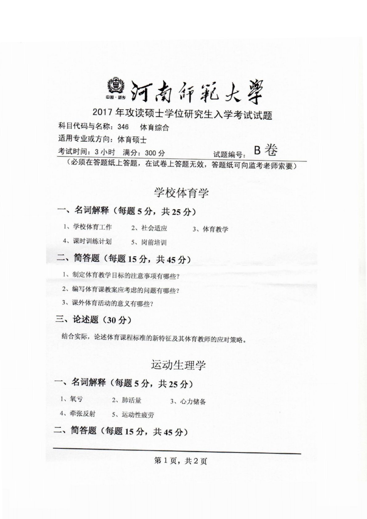 河南师范大学346体育综合2017年真题