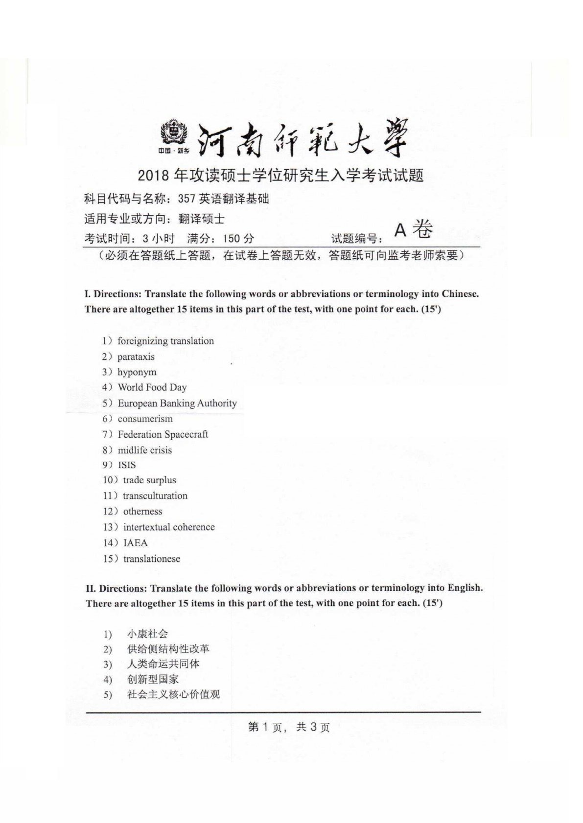 河南师范大学357英语翻译基础2018年真题