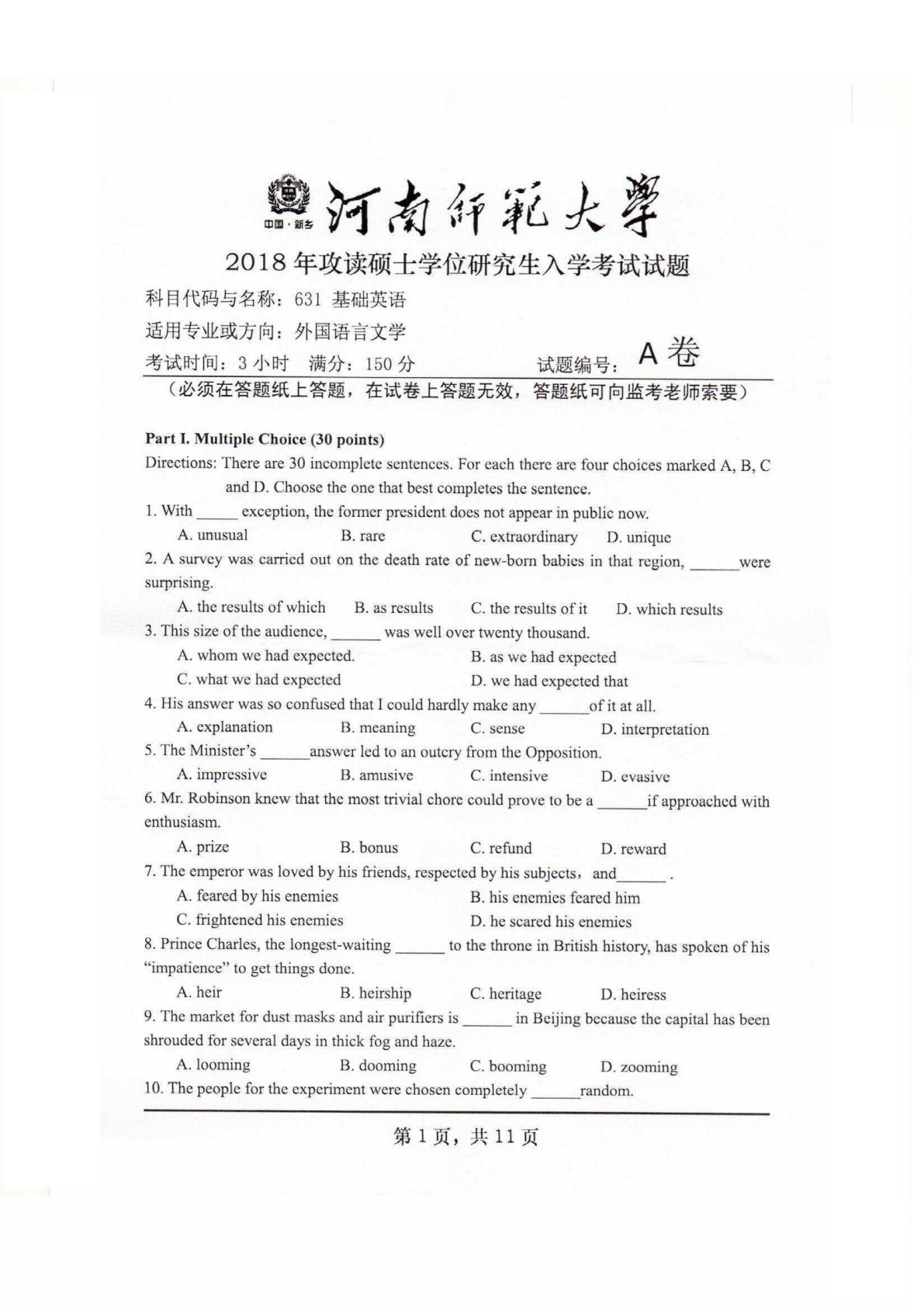 河南师范大学631基础英语2018年真题