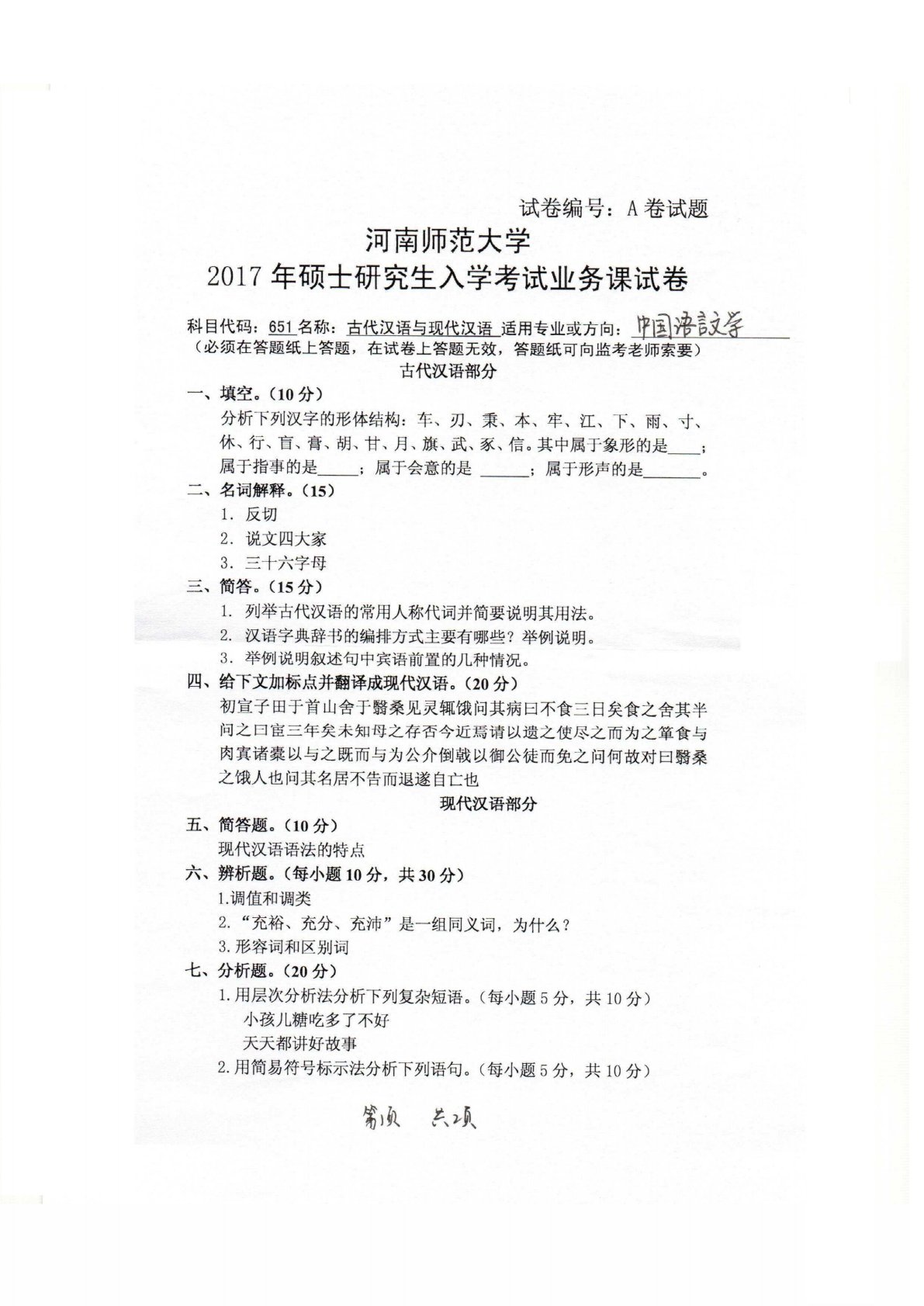 河南师范大学651古代汉语与现代汉语2017年真题