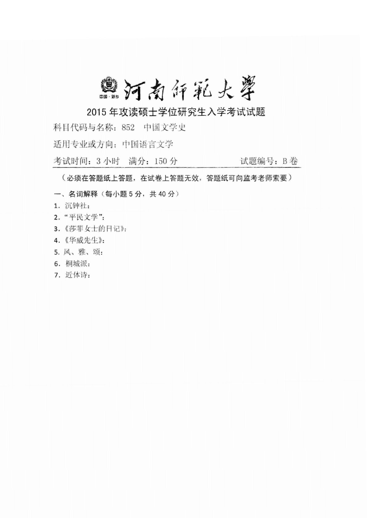 河南师范大学852中国文学史2015年真题
