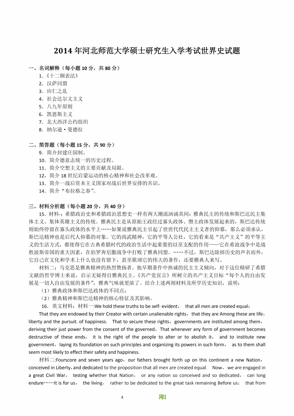 河北师范大学313历史学专业基础2014年世界史考研真题