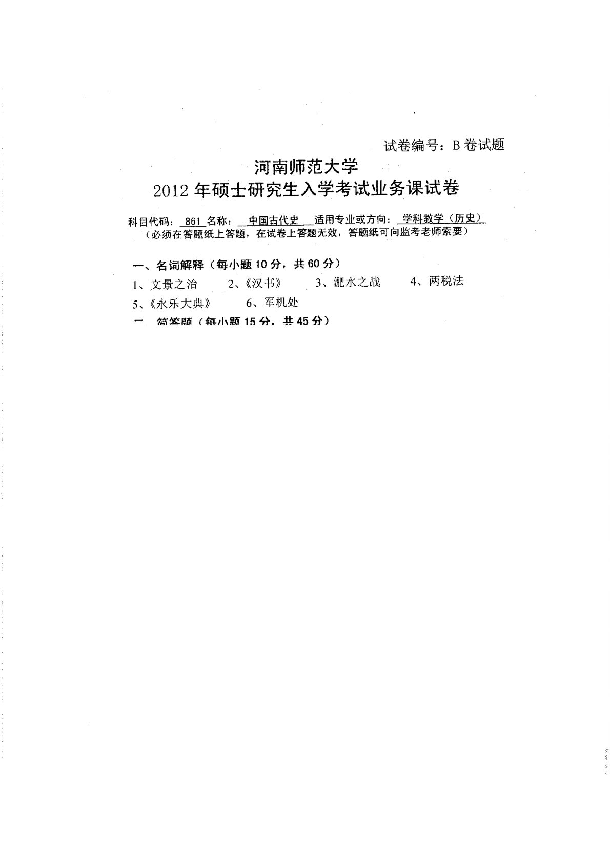 河南师范大学861中国古代史2012年真题