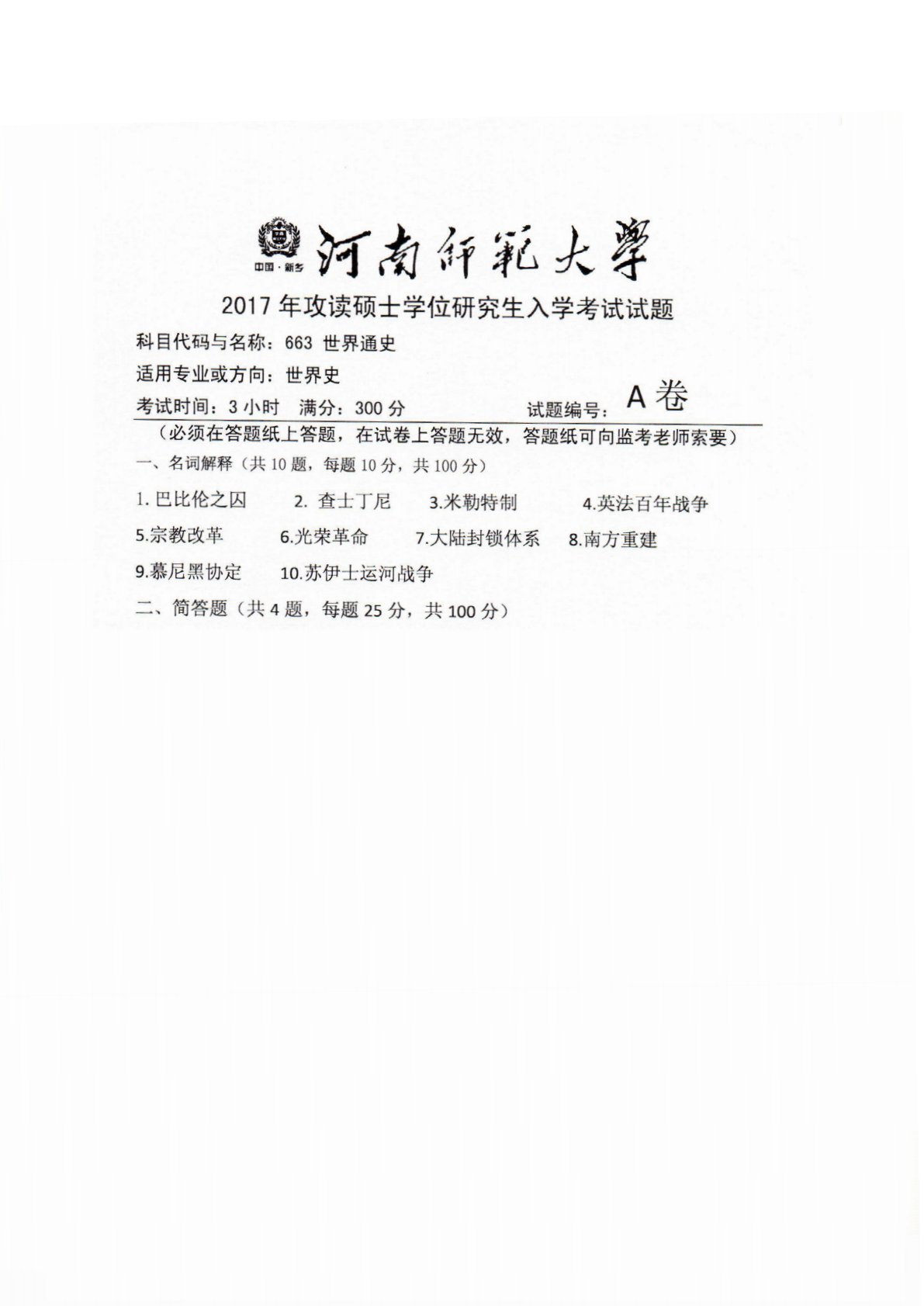河南师范大学663世界通史2017年真题