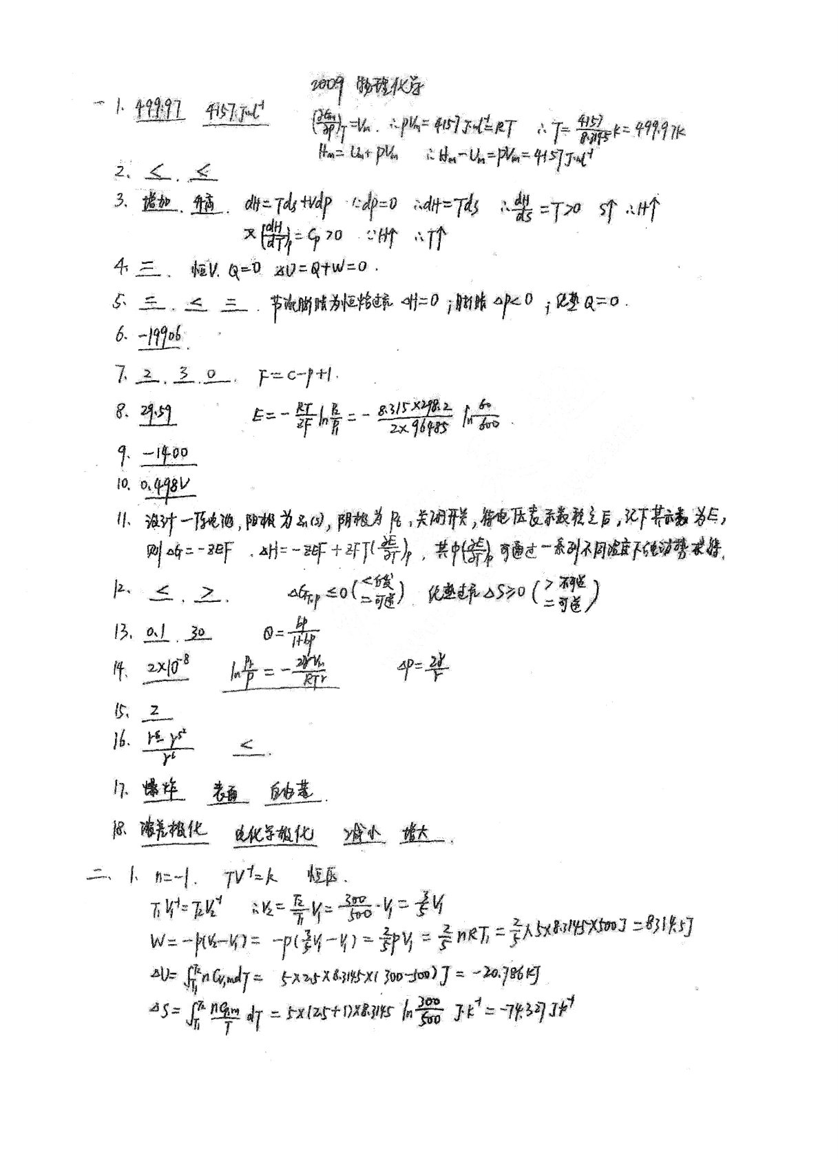 合肥工业大学839物理化学2009年考研真题答案手写版