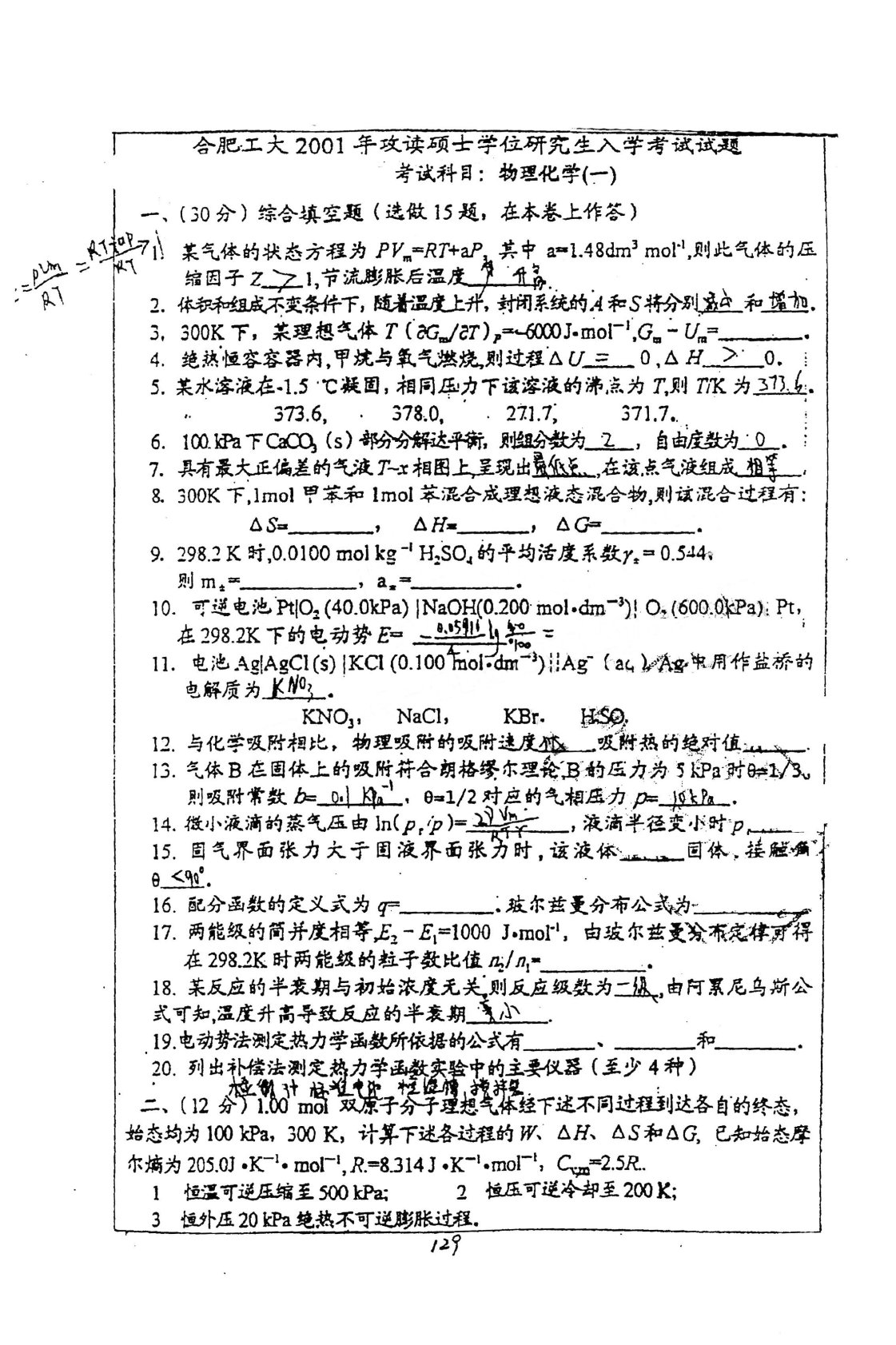 合肥工业大学839物理化学2001年考研真题