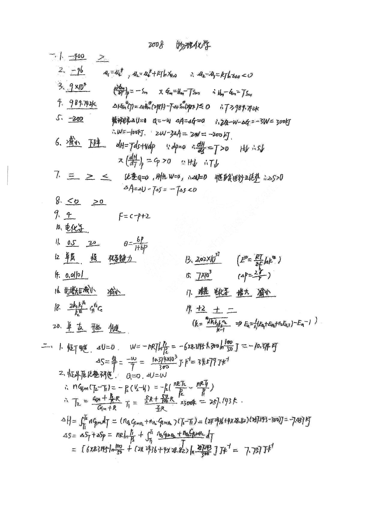 合肥工业大学839物理化学2008年考研真题答案手写版