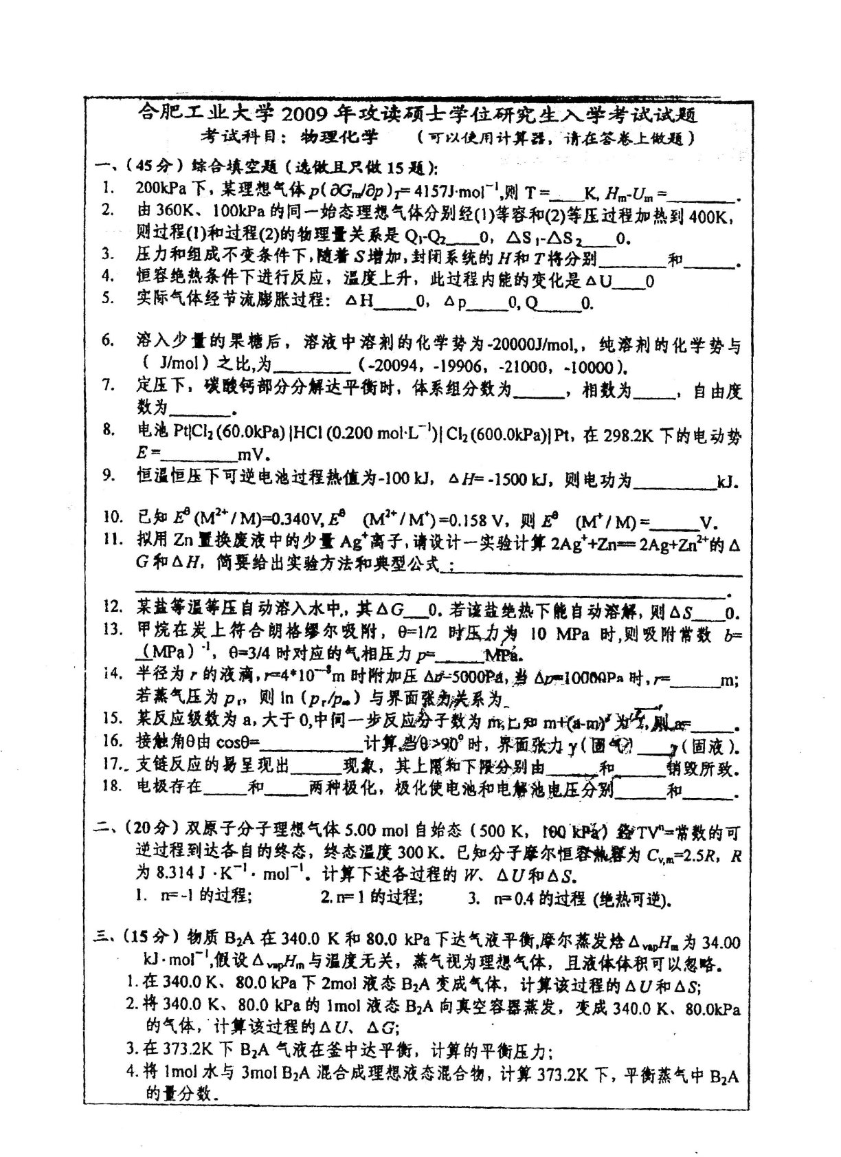 合肥工业大学839物理化学2009年考研真题
