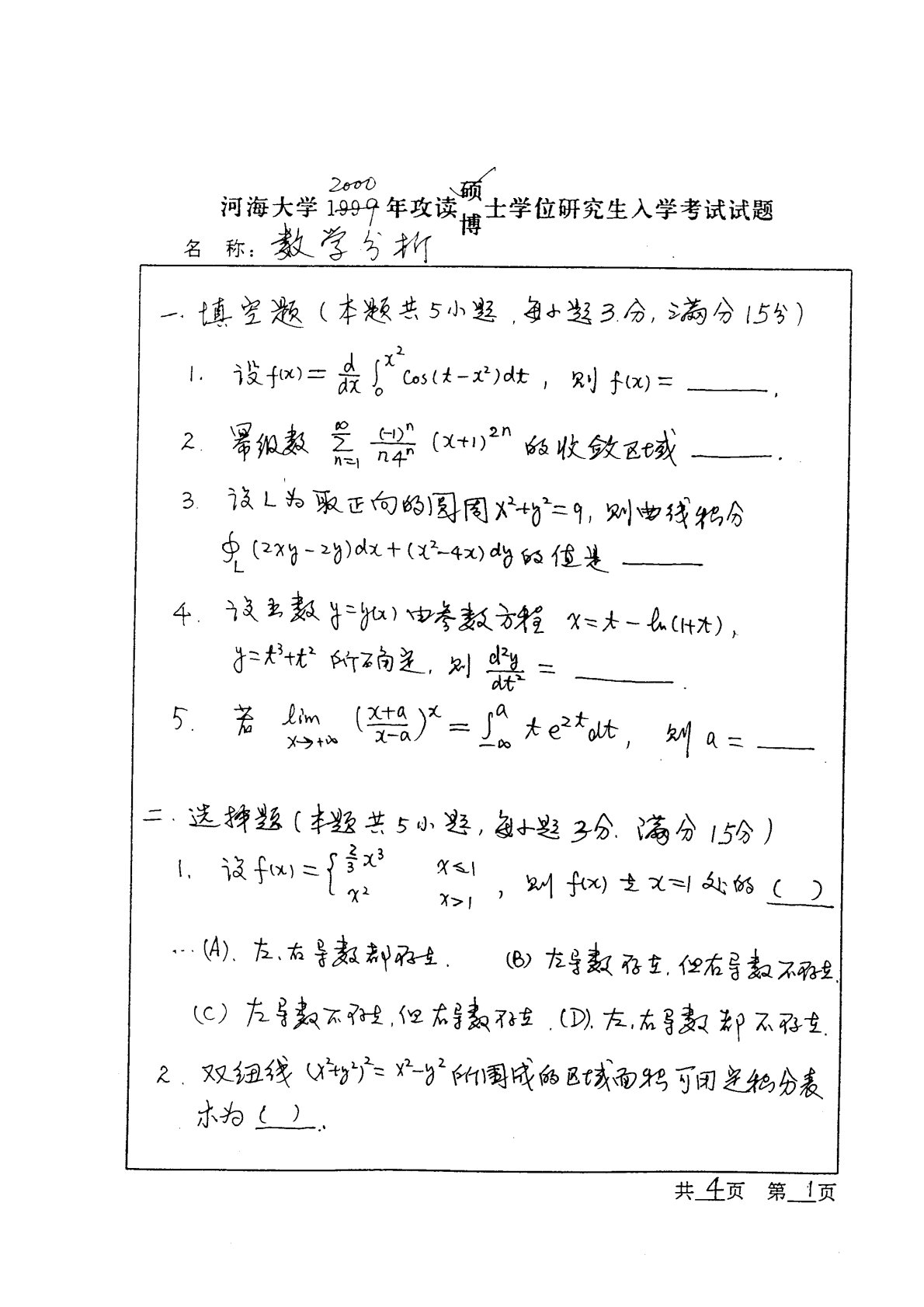 河海大学616数学分析2000年真题手写版