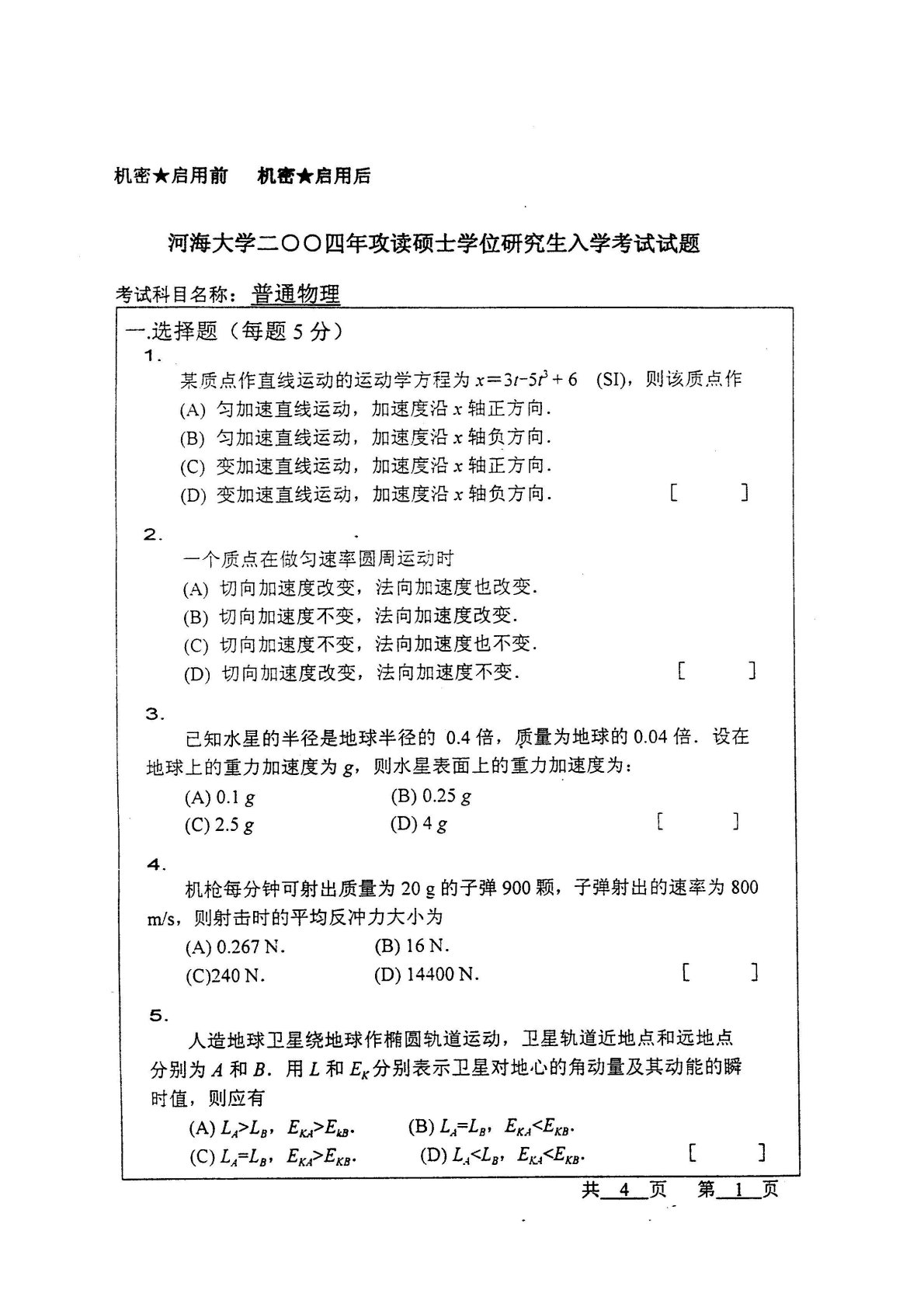 河海大学637普通物理2004年真题