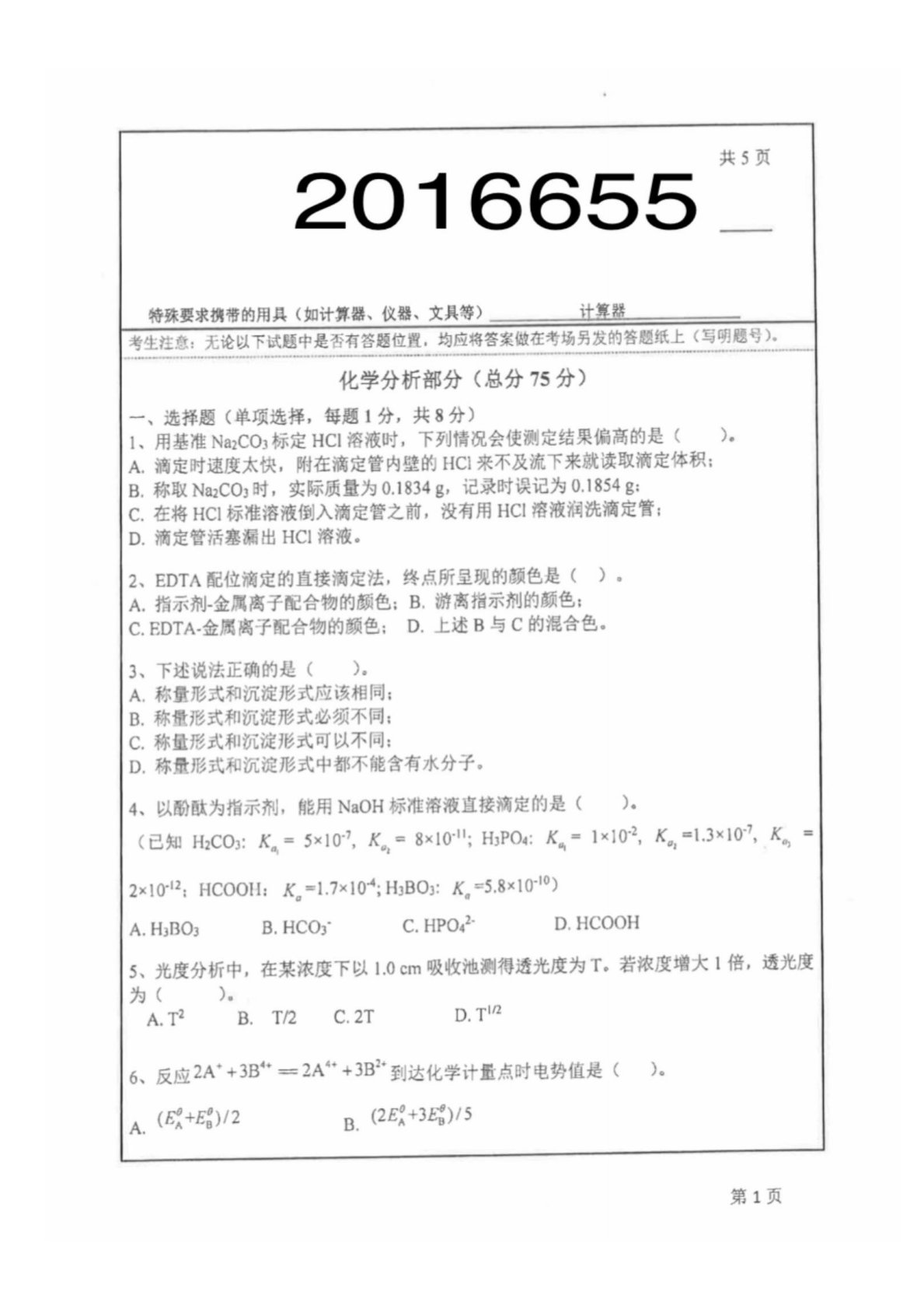 华东师范大学805普通化学原理二2016年真题(分析化学)