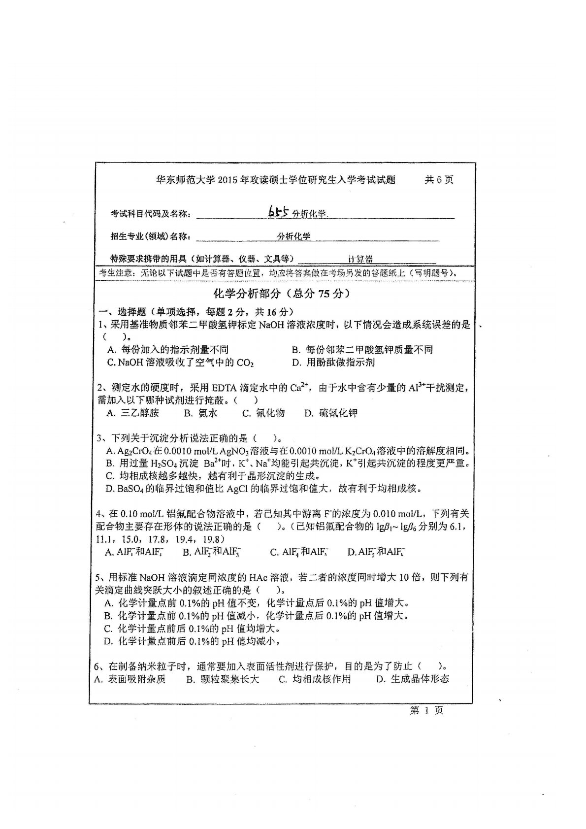 华东师范大学805普通化学原理二2015年真题(分析化学)
