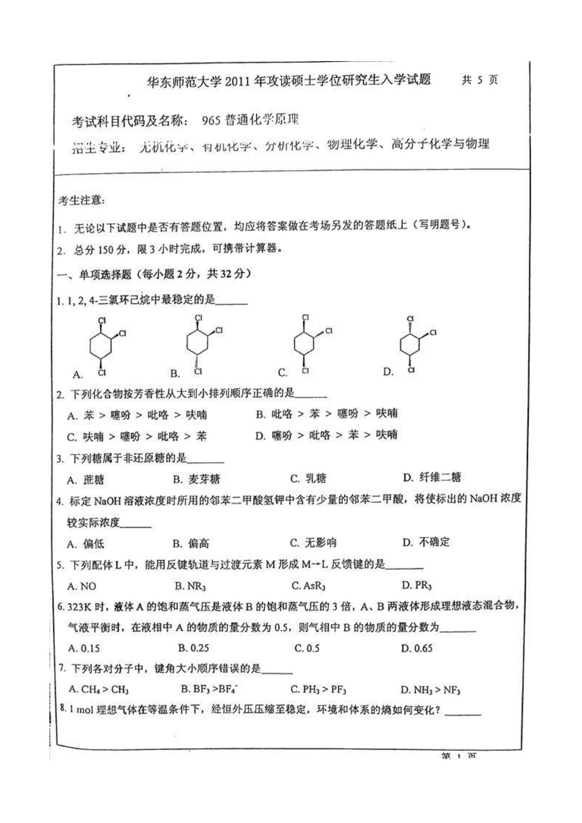 华东师范大学816普通化学2011年考研真题