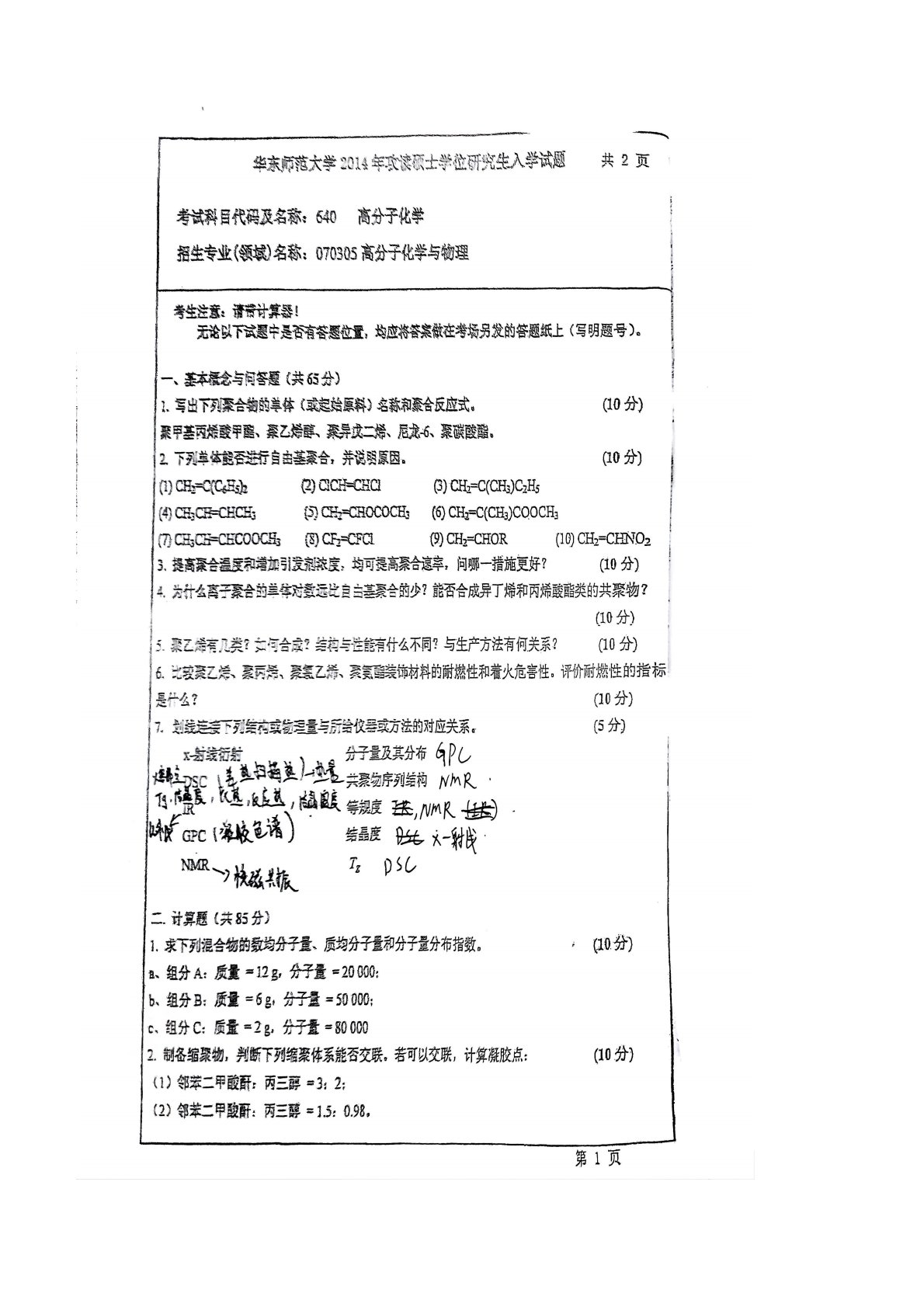 华东师范大学805普通化学原理二2014年真题(高分子化学)