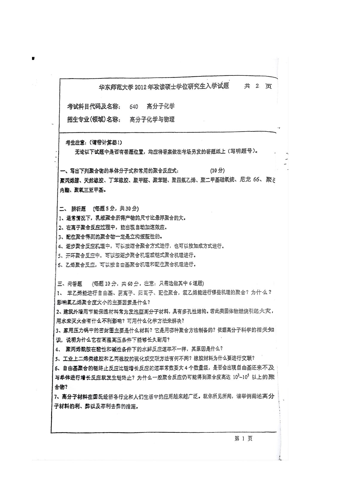 华东师范大学805普通化学原理二2012年真题(高分子化学)
