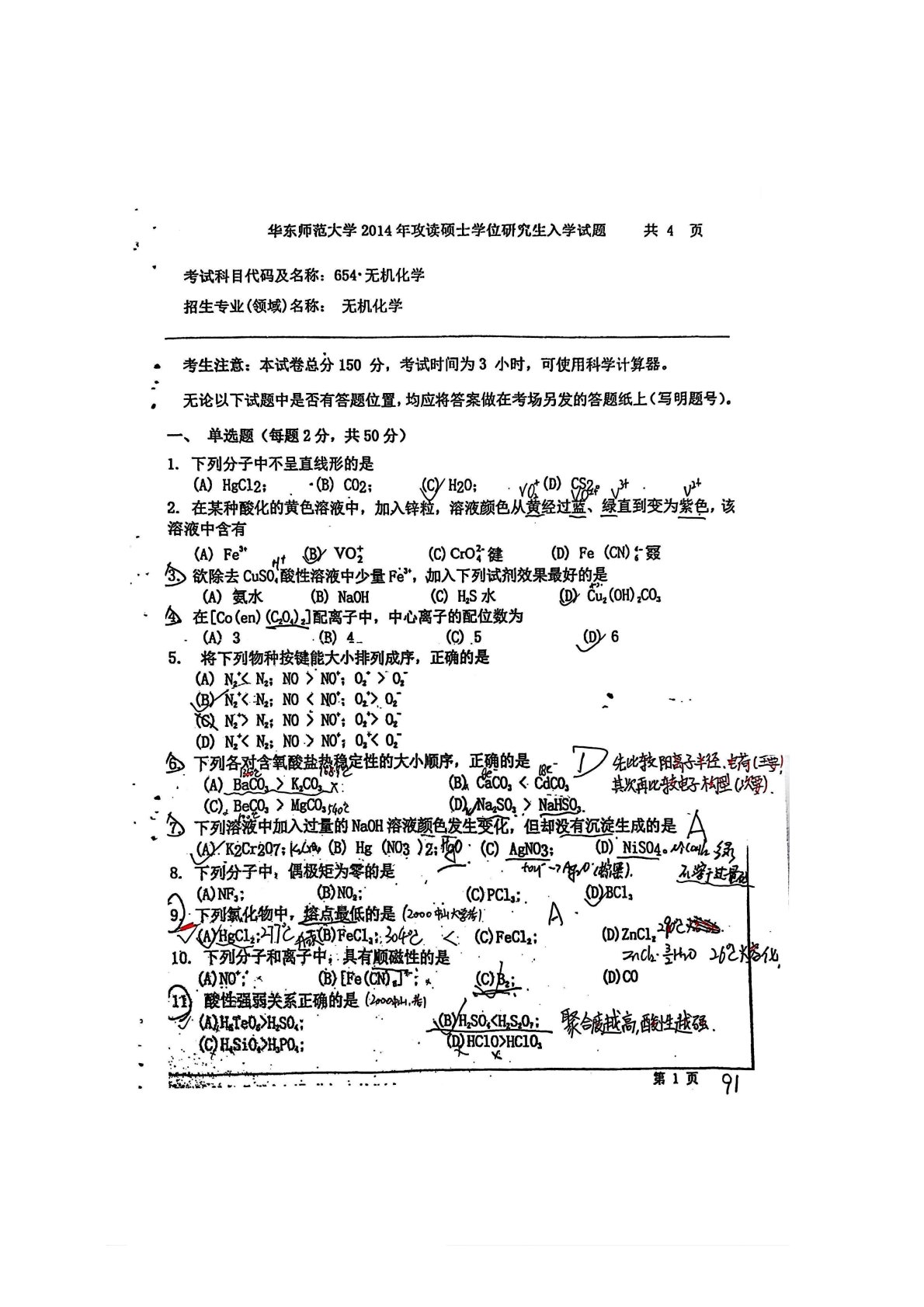 华东师范大学640普通化学原理一2014年真题答案(无机化学)(手写版)