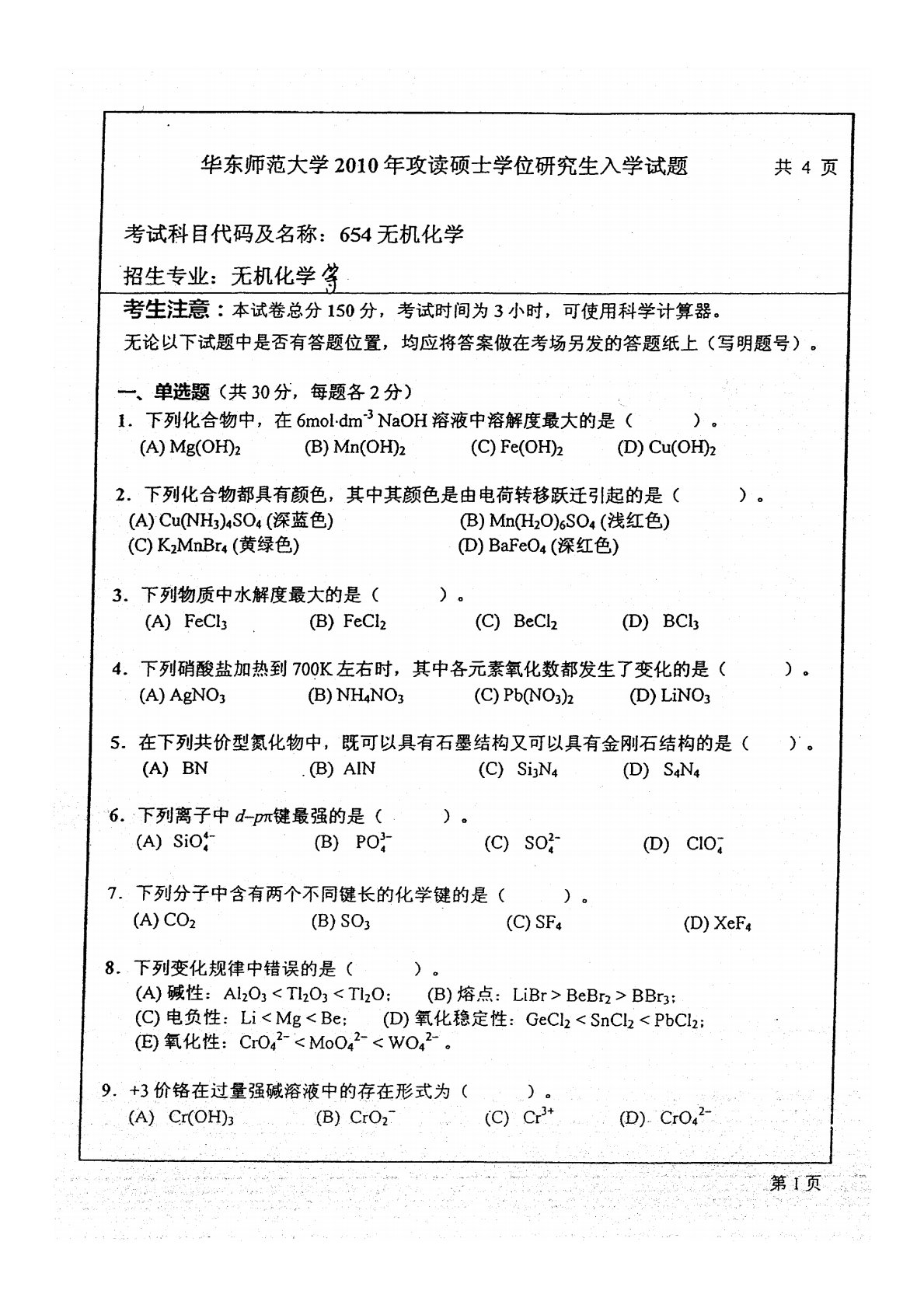 华东师范大学640普通化学原理一2010年真题