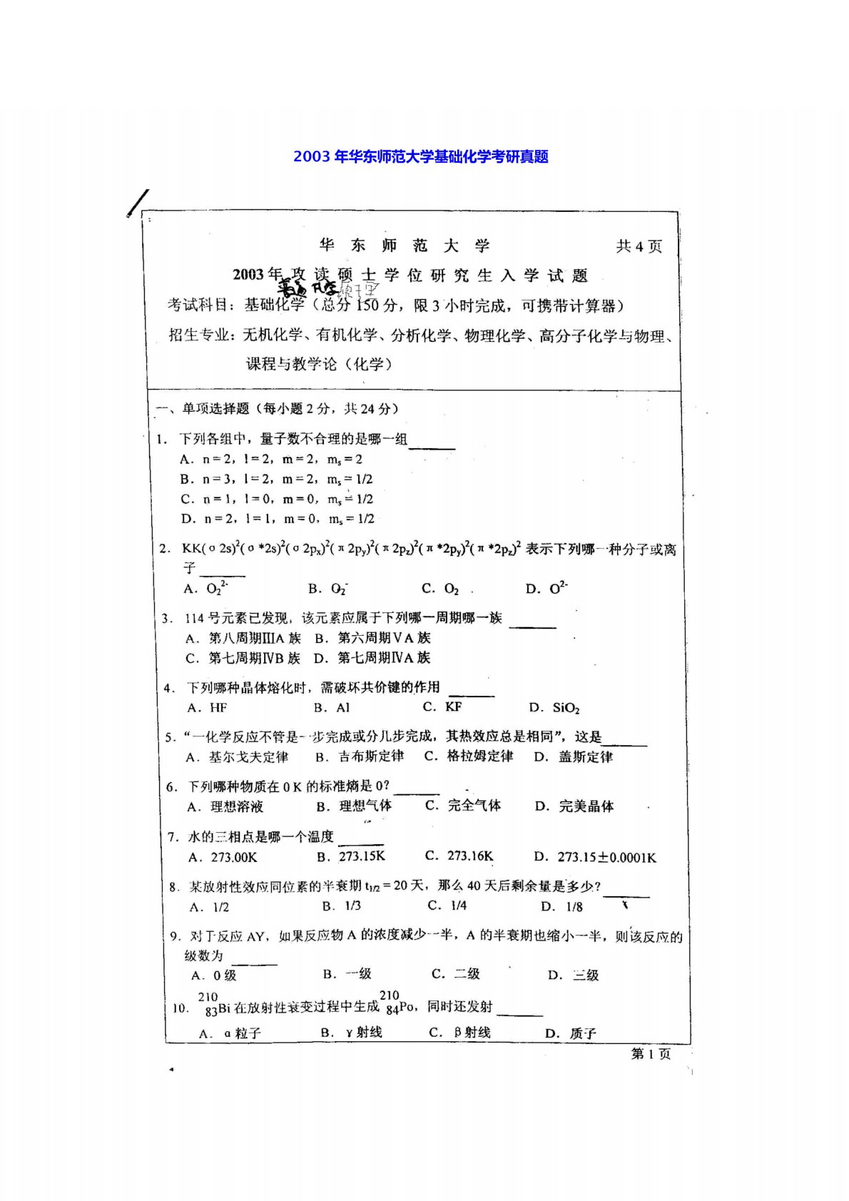 华东师范大学865普通化学原理2003年真题