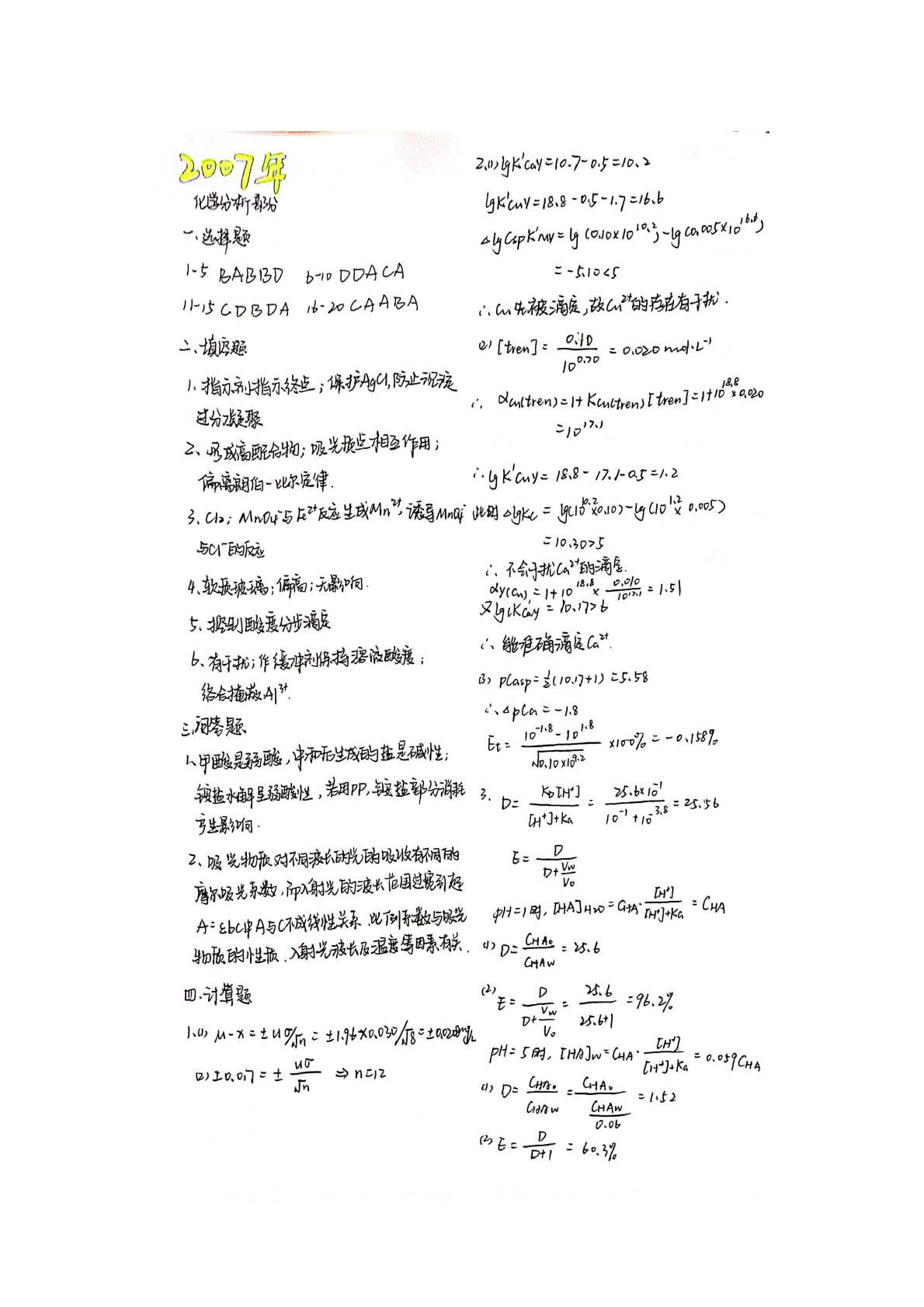 华东师范大学805普通化学原理二2007年真题答案(分析化学)