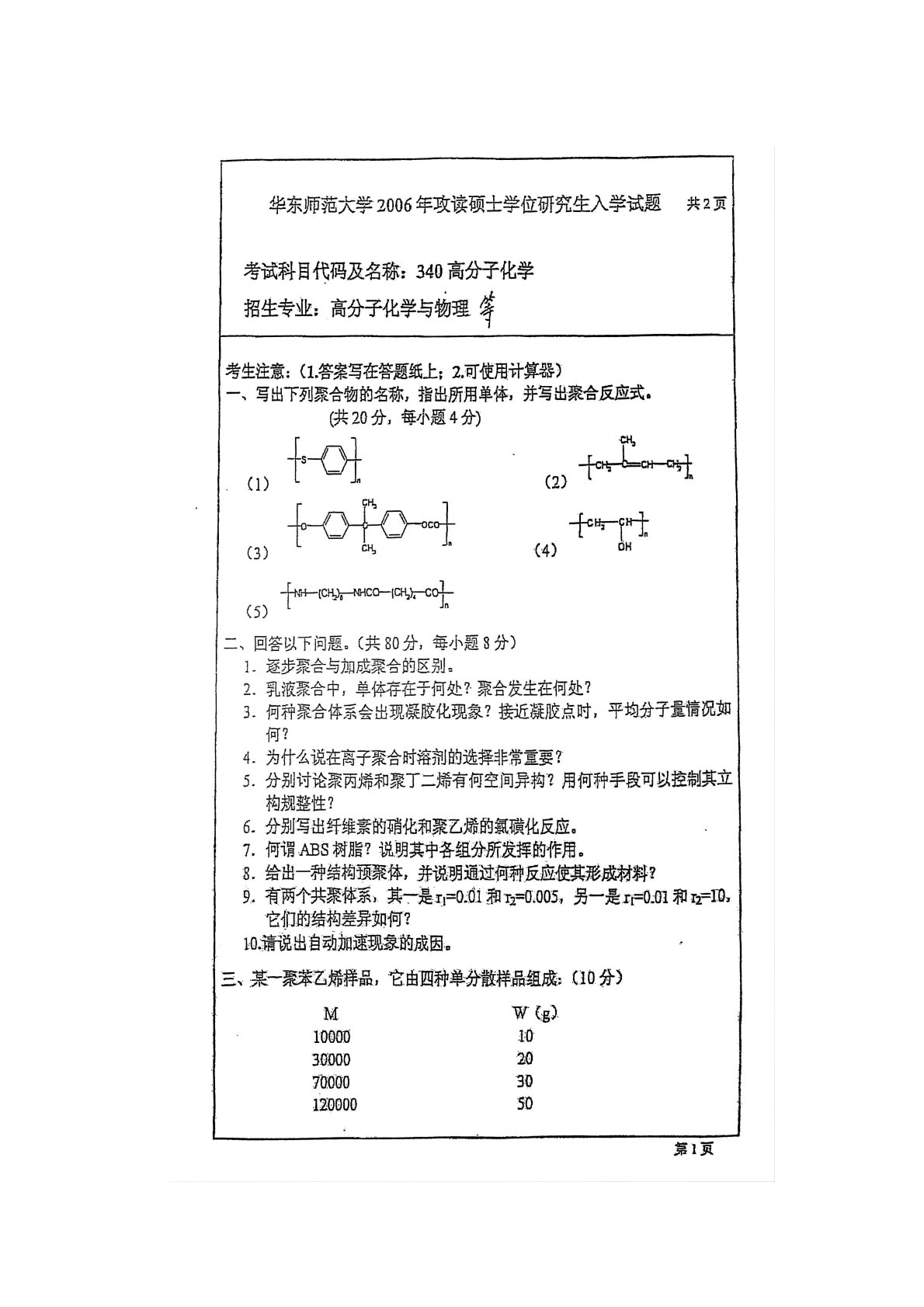 华东师范大学805普通化学原理二2006年真题(高分子化学)