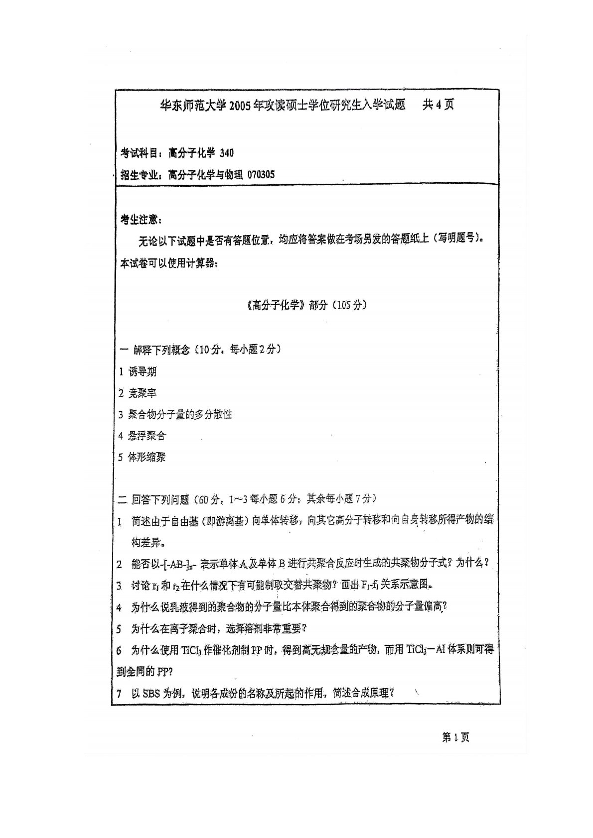 华东师范大学805普通化学原理二2005年真题(高分子化学)