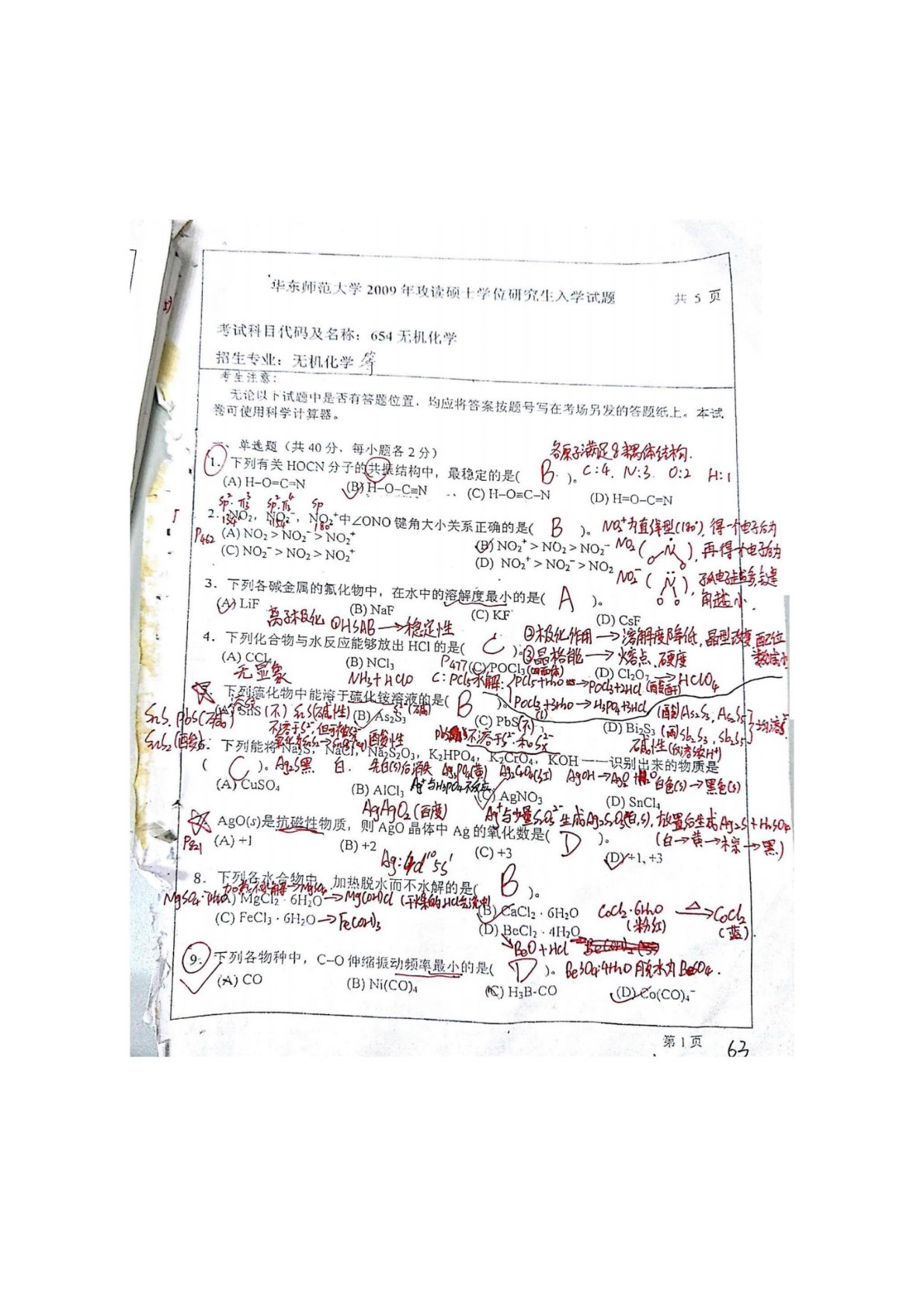 华东师范大学640普通化学原理一2009年真题答案(无机化学)(手写版)